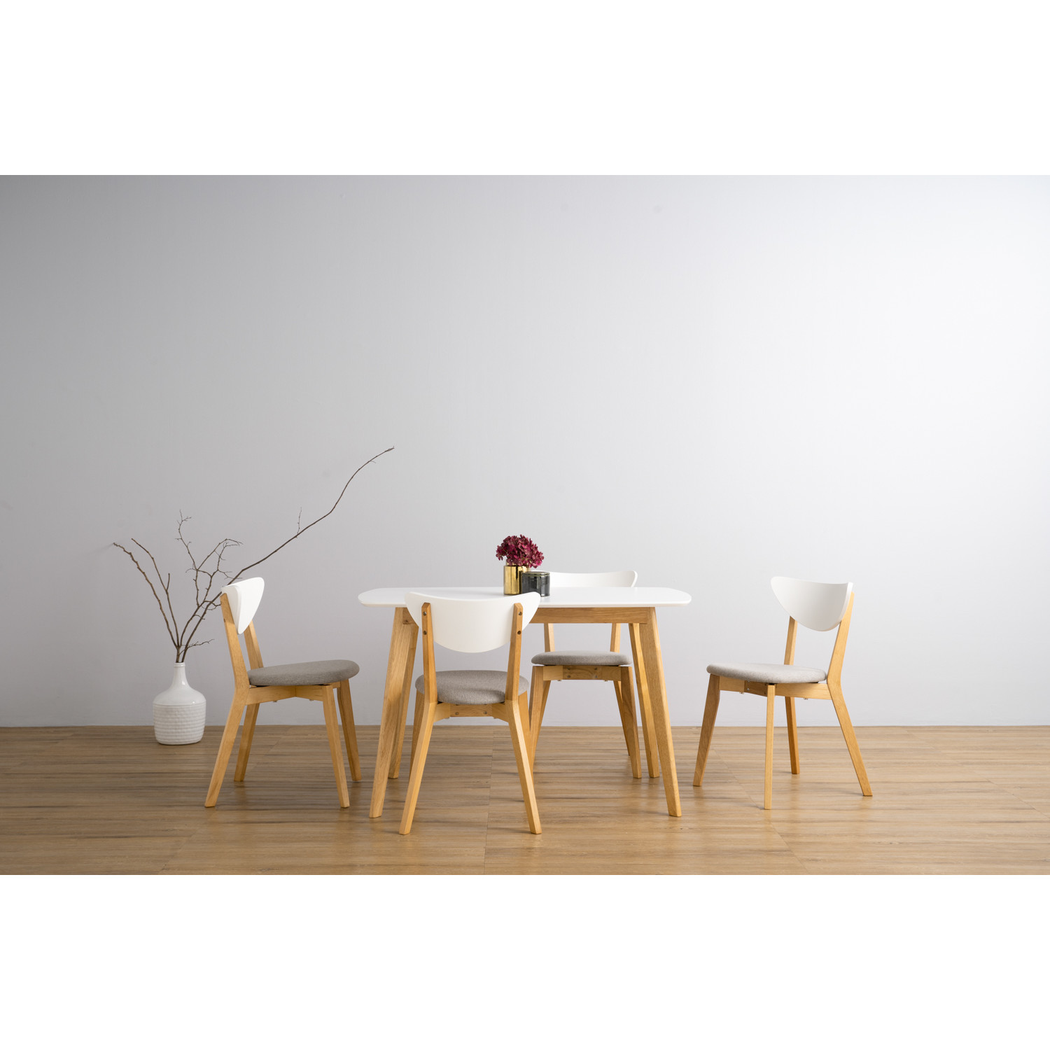 Aimon 750 x 1200 dining table in Natural colour leg, White lacquered top. The Aimon Dining Table in natural and white lacquer brings minimalist elegance to the dining area. Supported by Malaysian oak legs with a clean MDF top, it balances practicality with modern design. The contrasting finishes create a fresh, versatile look that complements contemporary interiors.
