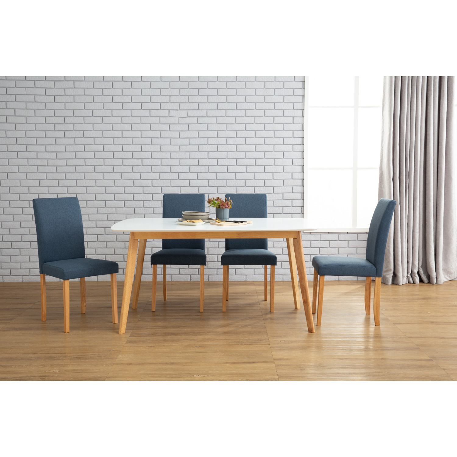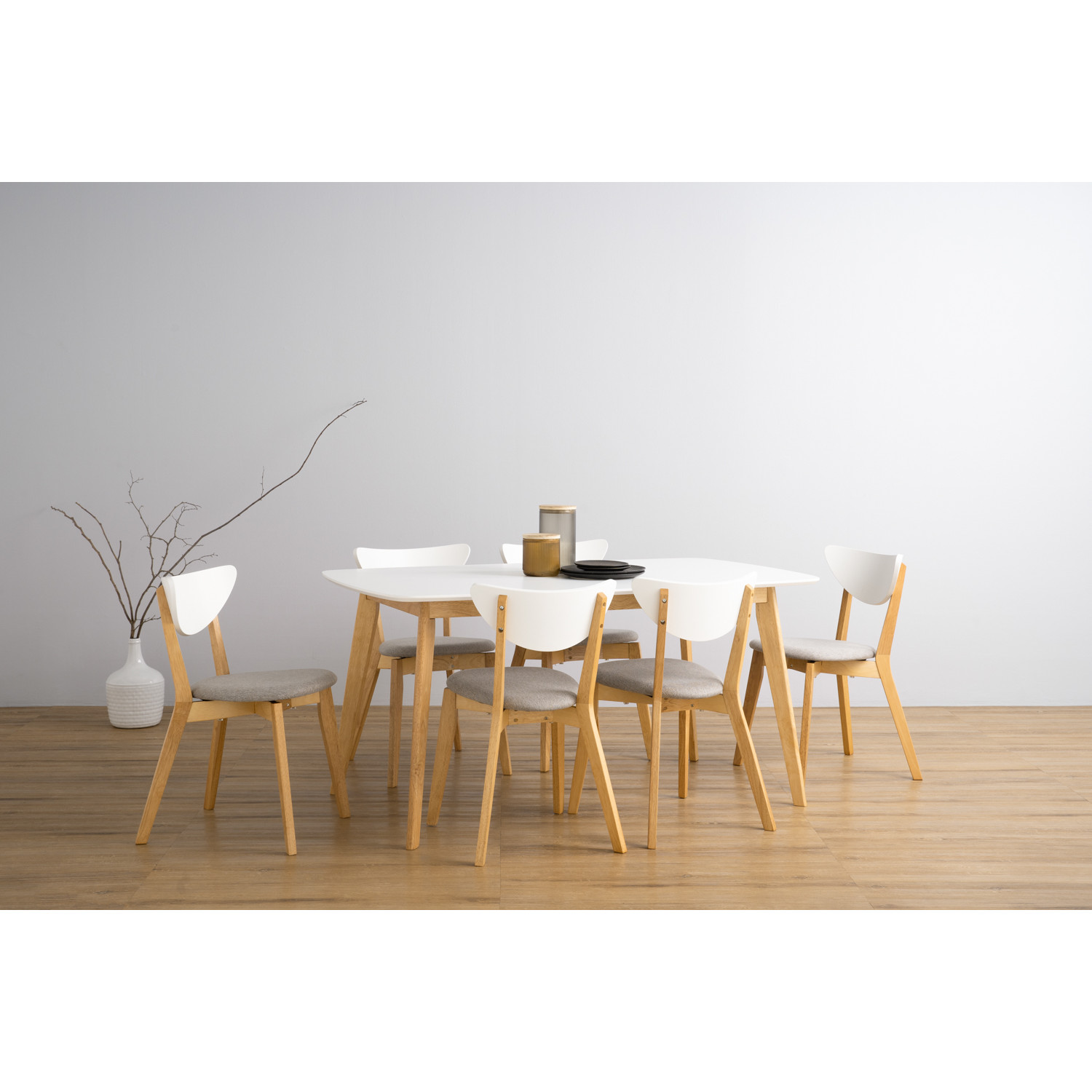 Aimon 900 x 1500 dining table in Natural colour leg, White lacquered top. The Aimon Dining Table blends minimalist design with Mid-Century Modern appeal. Supported by sturdy Malaysian oak legs and topped with MDF in a natural and white finish, it creates a fresh, versatile look. Its clean lines and timeless style make it a perfect fit for modern dining spaces.