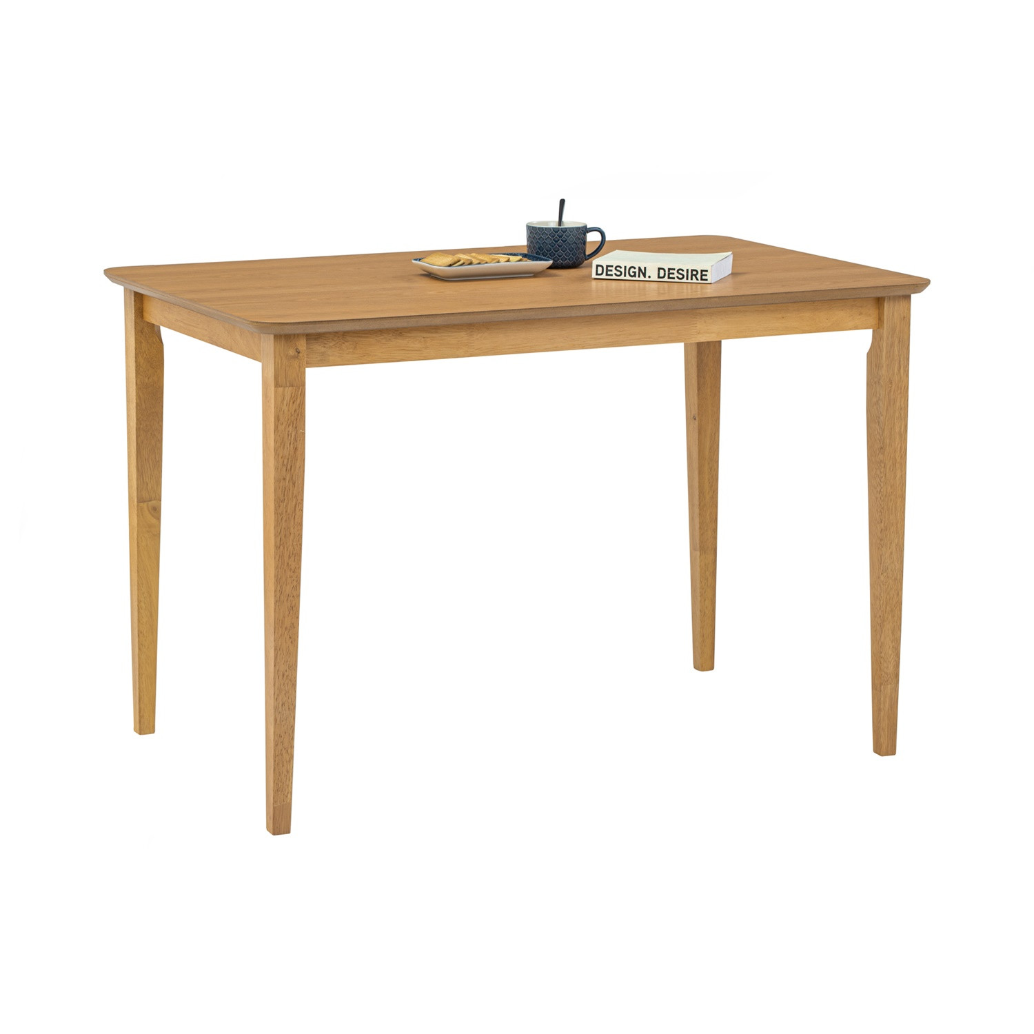 Allegro 750×1200 dining table in Natural colour. The Allegro Dining Table offers a minimalist yet modern design with Mid-Century influence. Supported by natural-finished Malaysian oak legs and topped with MDF and ash veneer, it radiates warmth and simplicity. A functional piece designed for modern dining environments.