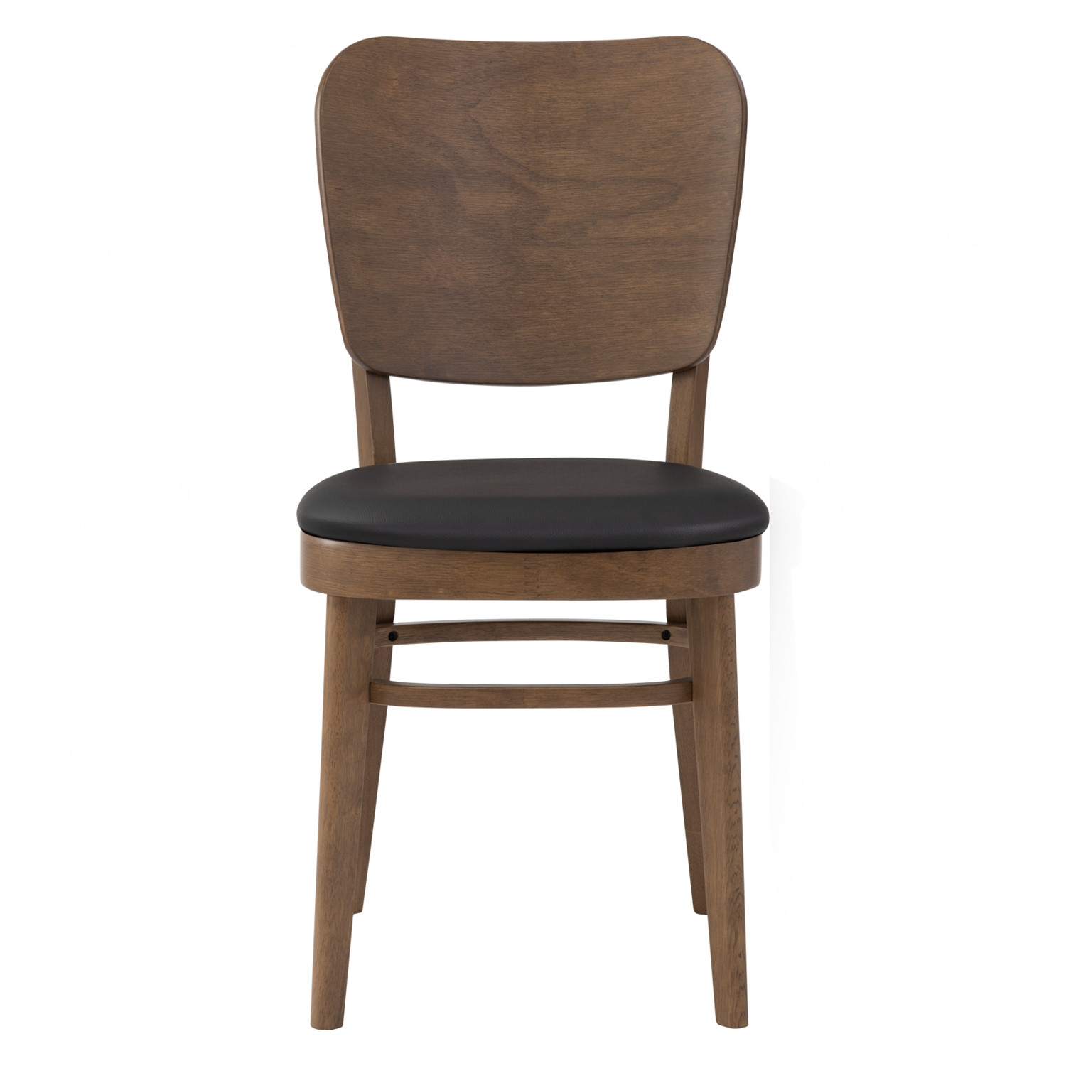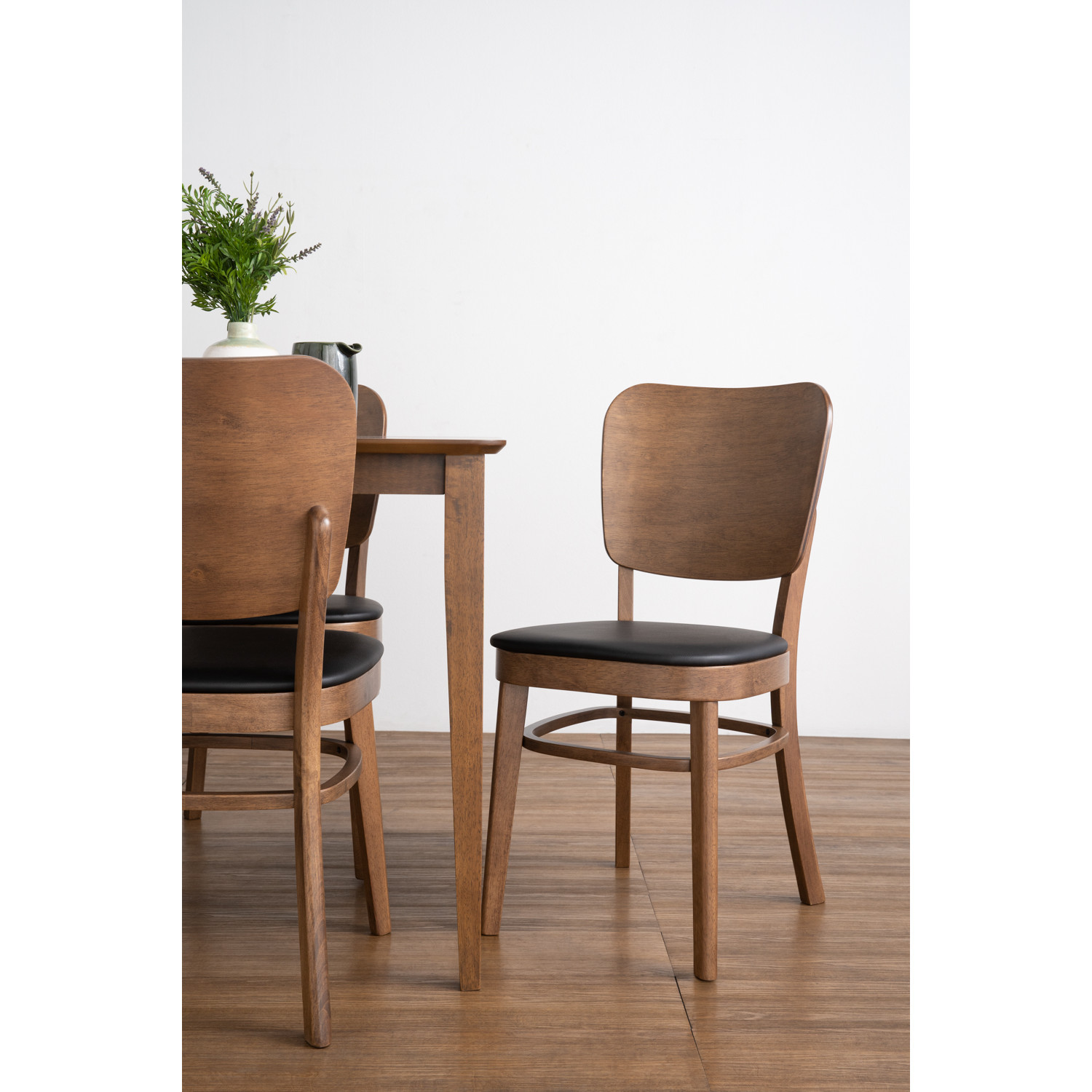 Beverly dining chair in Cocoa colour frame, Espresso colour Premium Vinyl (With stretcher). The Beverly Dining Chair blends rustic character with mid-century elegance. Its cocoa oak legs and bentwood backrest highlight natural craftsmanship. The espresso vinyl seat adds durability while keeping the design refined. Its tall, slim form complements both classic and modern dining spaces. A timeless choice for everyday dining with style.