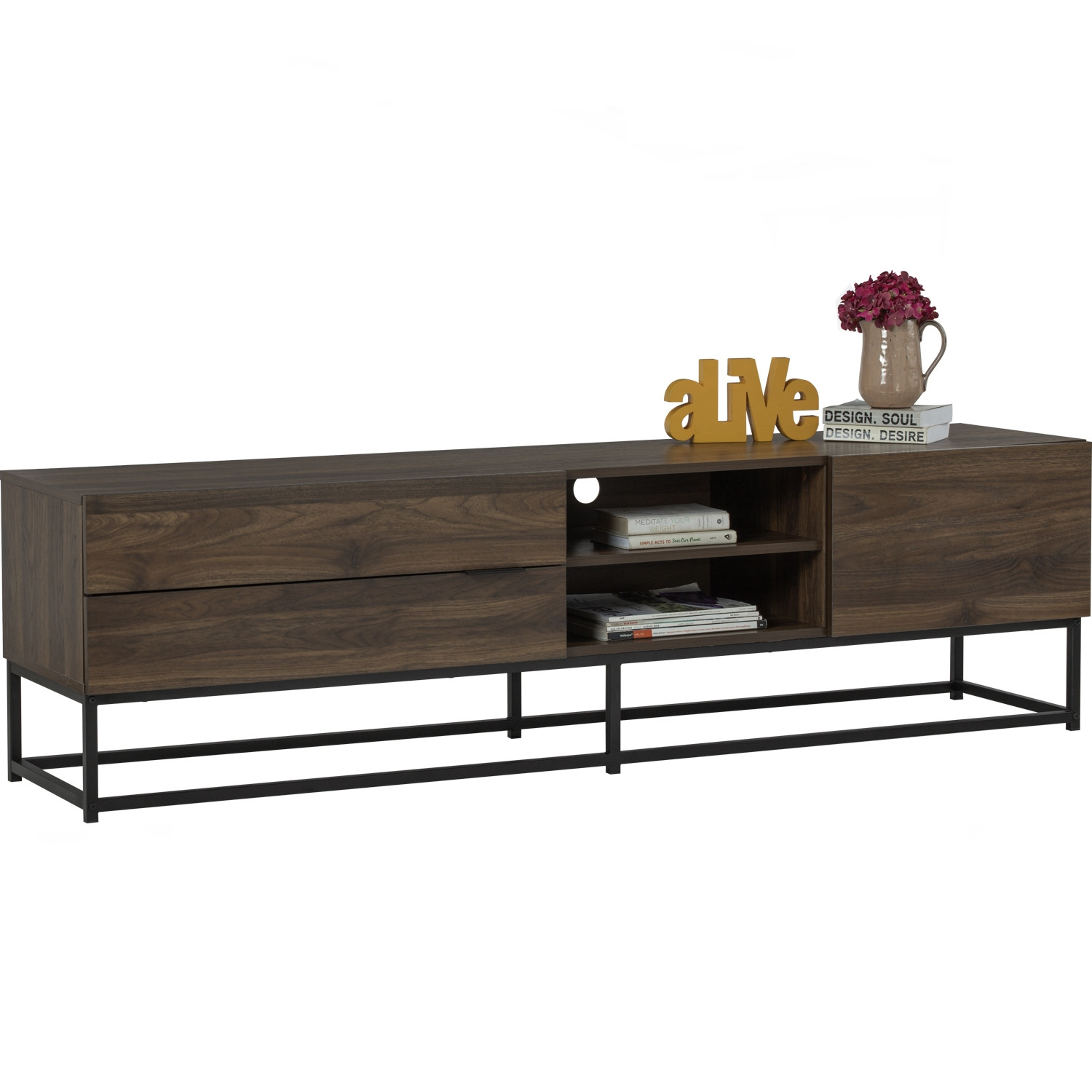 Capri 1.8m tv cabinet in Matt Black Epoxy colour leg, Walnut colour top. The Capri 1.8M TV Cabinet blends industrial strength with modern appeal. Featuring black metal legs and a walnut laminated body, it offers durability and a sleek, contemporary look. Its generous length provides ample storage for media essentials, while the streamlined profile fits seamlessly into modern living rooms. A best-value cabinet designed for practical elegance.