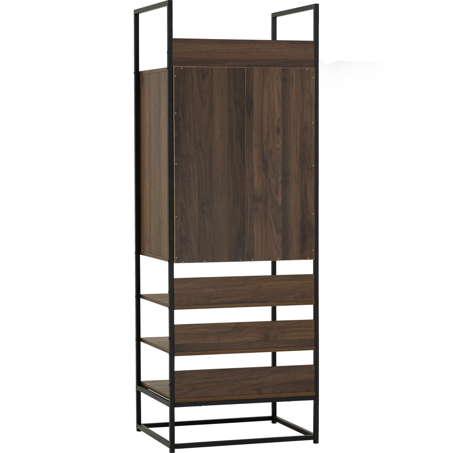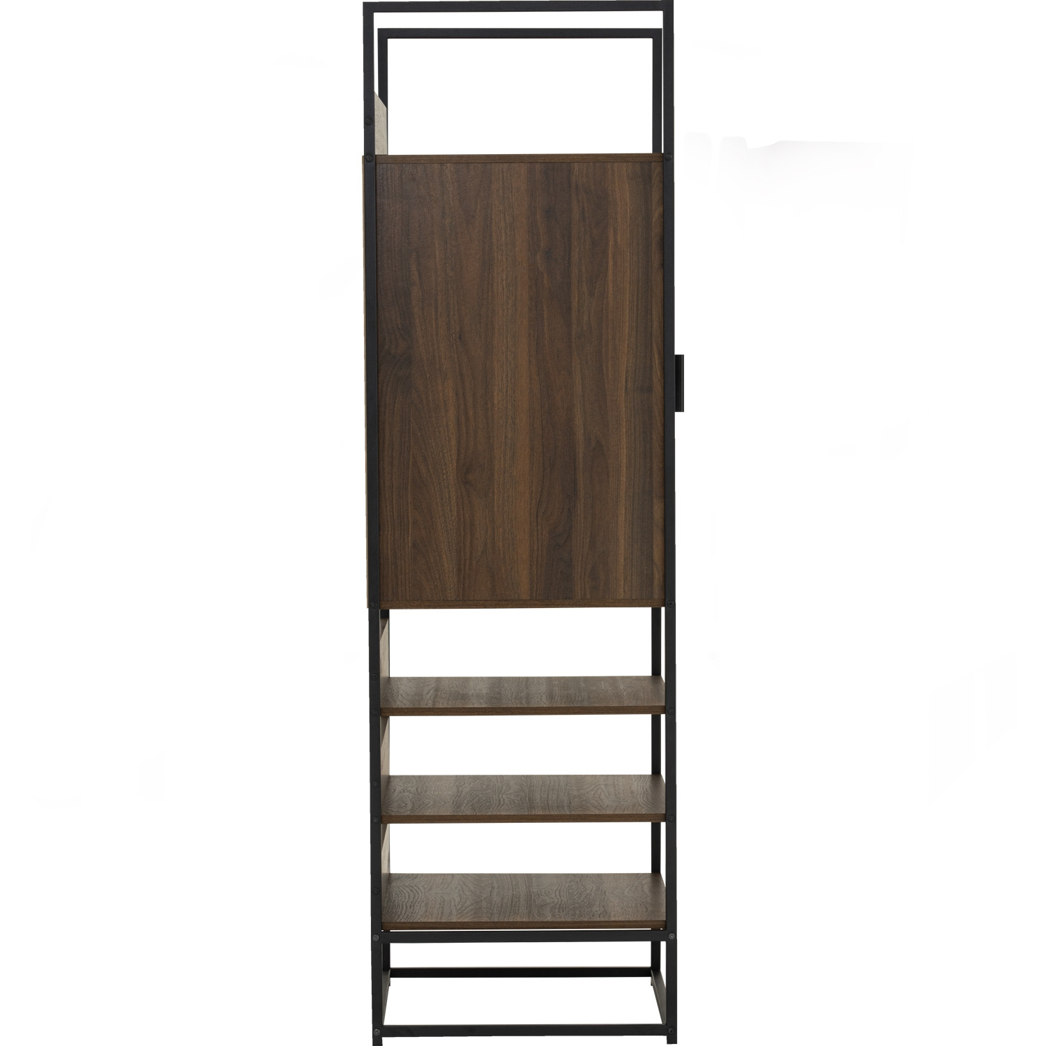 Capri open shelf wardrobe with 1 door in Matt Black Epoxy colour leg, Walnut colour shelf. This narrow Capri Open Wardrobe captures the same industrial modern charm as the series, with a matte black frame and walnut laminated shelves, but in a more compact size. It’s perfect for smaller rooms, guest spaces, or apartments where space is limited yet style is essential. The open layout provides quick access to daily wear while offering a decorative element to interiors. Durable materials ensure long-lasting use, while its slim structure keeps spaces airy and uncluttered. A practical, space-saving storage solution for modern living.
