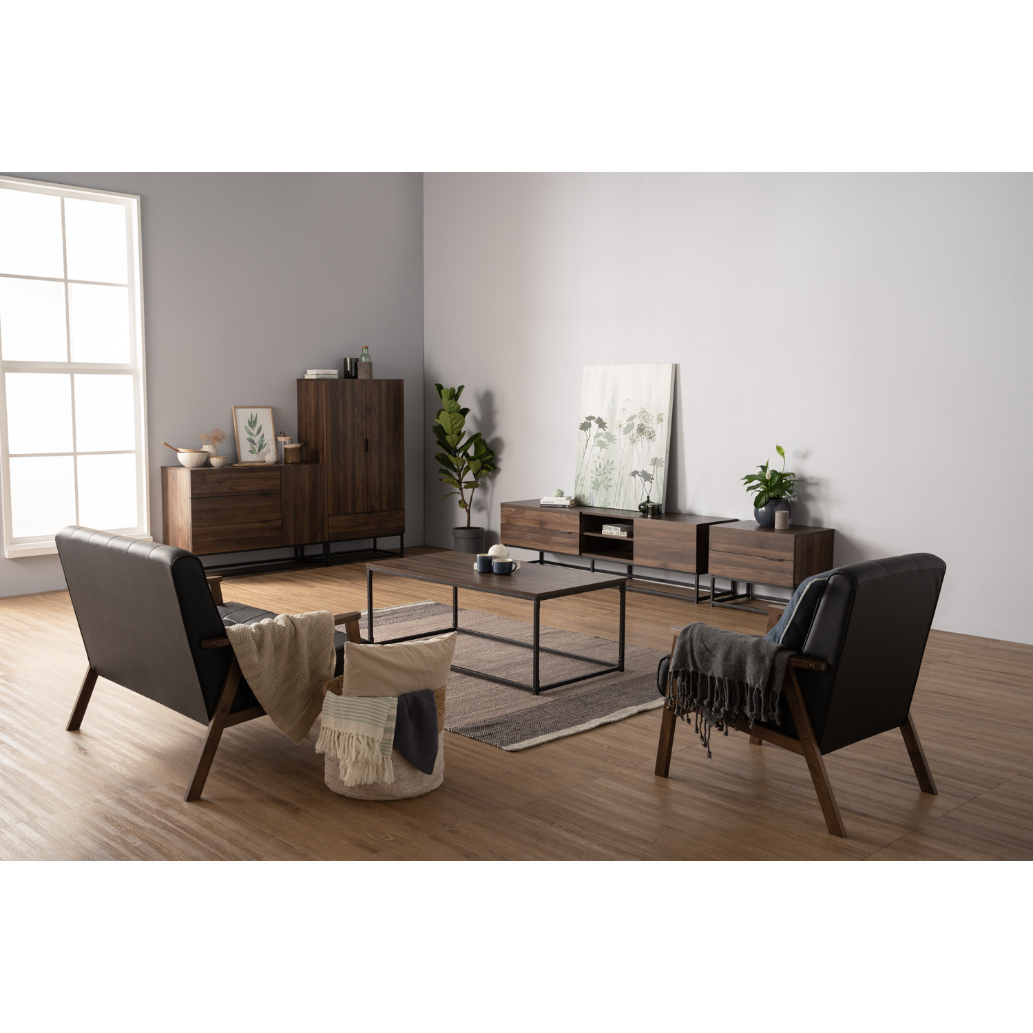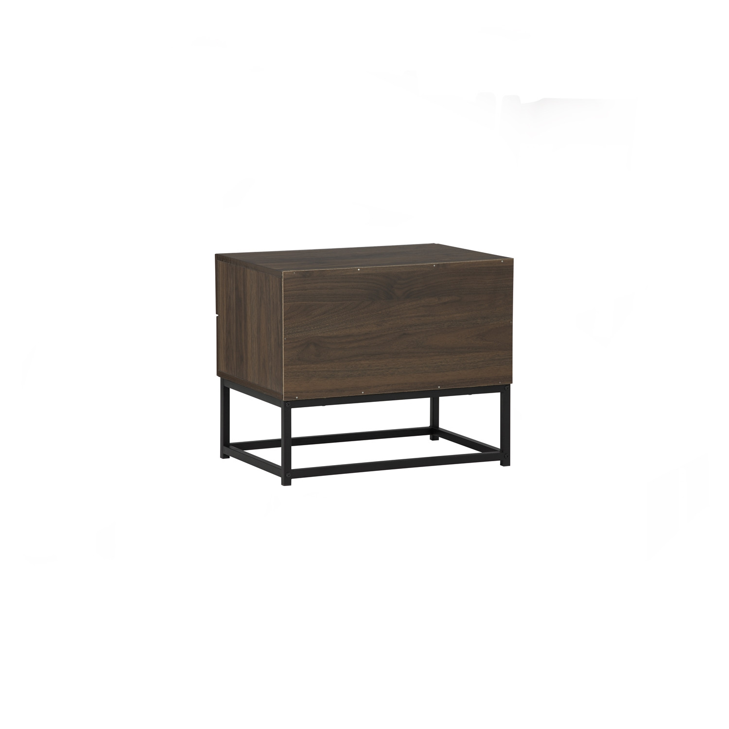 Capri side table in Matt Black Epoxy colour leg, Walnut colour top. The Capri Side Table embraces minimalist design with mid-century flair. Featuring a metal frame and laminated surface, it balances durability with clean aesthetics. Two drawers offer functional storage while maintaining a sleek look. Its compact form makes it ideal for modern apartments or cozy bedrooms. A versatile piece that enhances both function and style.