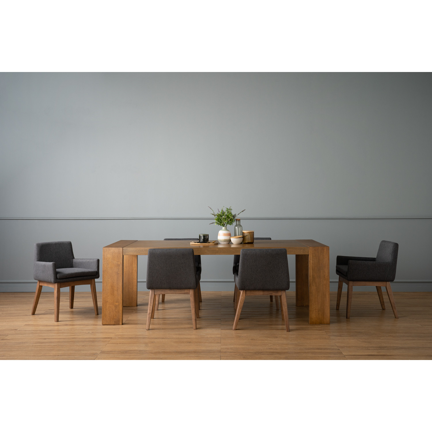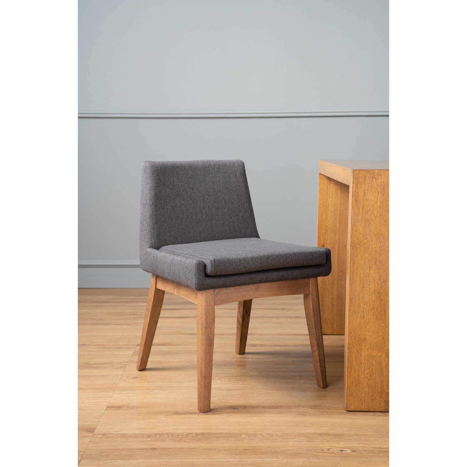 Chanel dining chair in Cocoa colour leg, Seal colour Dimity fabric frame. The Chanel Dining Chair presents refined style with everyday comfort. Built with Malaysian Oak legs in cocoa, it provides strength and a warm natural tone. The dimity fabric upholstery in seal grey adds softness and sophistication. With its clean lines and versatile design, this chair complements contemporary dining rooms and stylish commercial interiors.