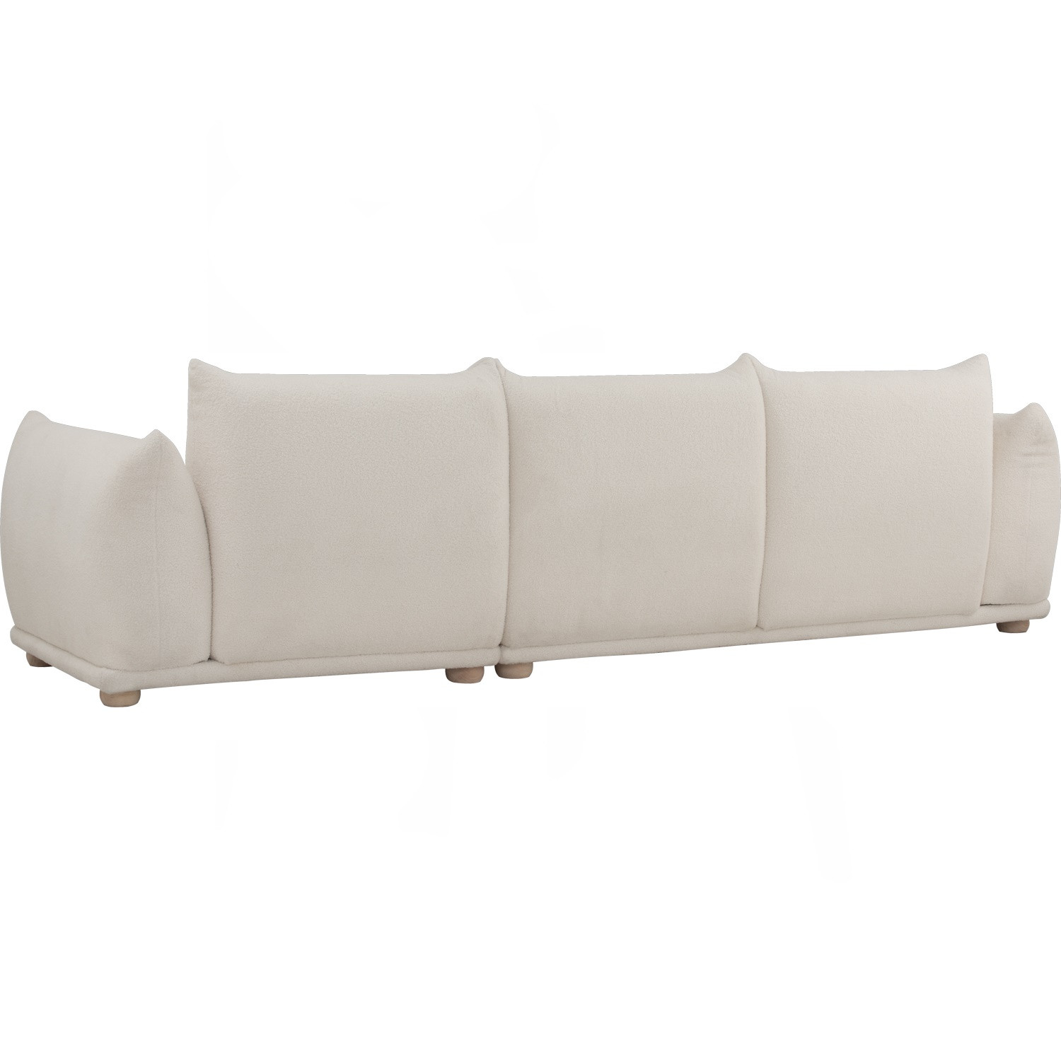 Clio 3 seater sofa with White wash leg, Cream White colour Teddy fabric. The Clio 3 Seater Sofa is a statement of refined taste, merging Mid-Century Modern lines with Art Deco sophistication. Built on Malaysian Oak legs in a light white wash finish, the sofa presents a sleek silhouette that enhances interior spaciousness. Upholstered in plush Teddy fabric in an inviting cream white shade, it offers both comfort and luxury, ideal for elegant living spaces or boutique hospitality settings. The richness of its texture combined with the strength of oak ensures long-lasting appeal. This sofa embodies a harmonious blend of elegance and practicality, making it a versatile choice for refined interiors.