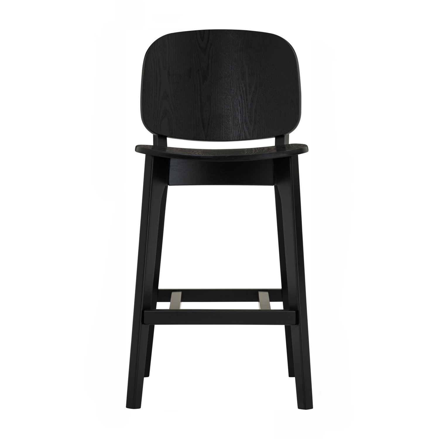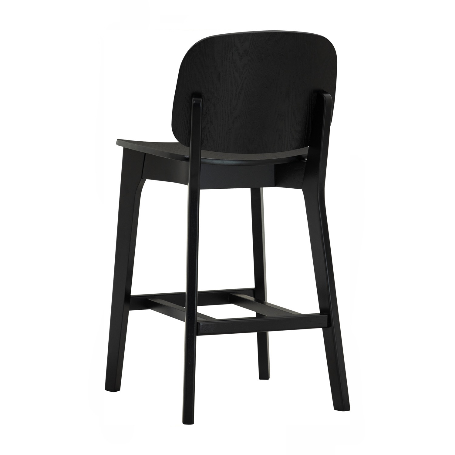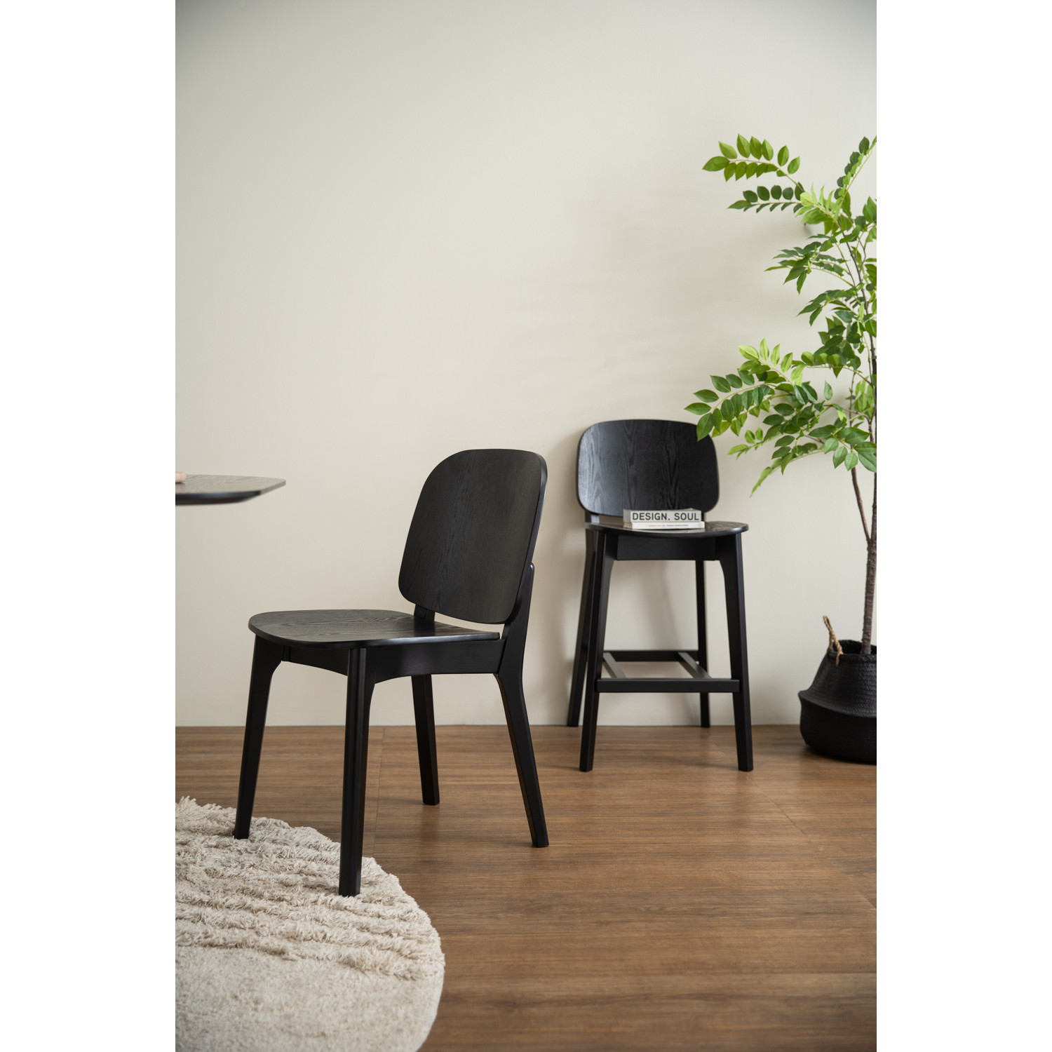 Cora counter chair in Black colour frame and seat.. The Cora Counter Chair, made with black oak, bentwood, and ash veneer, showcases sleek Scandinavian design. Its elevated height suits kitchen islands or bar tables, while the curved back provides ergonomic comfort. Lightweight yet strong, it blends simplicity with elegance, making it ideal for modern dining and entertaining spaces.