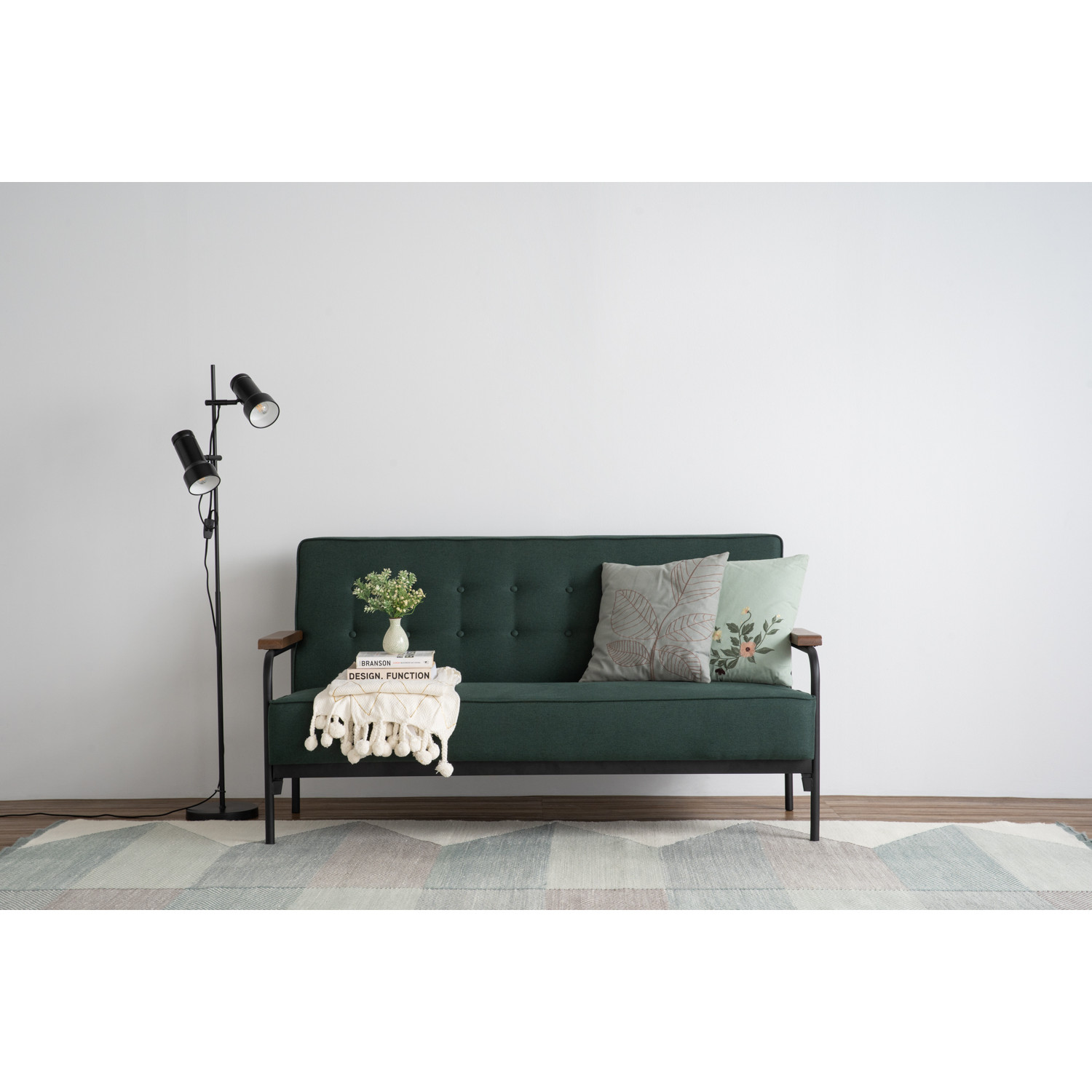 Dzire 3 seater sofa with Matt Black Epoxy colour leg, Cocoa colour handle and Kale colour Doublet fabric. The Dzire 3 Seater Sofa blends Mid-Century Modern appeal with Art Deco refinement. Its sleek metal legs add strength and contrast, while cocoa-toned oak arms warm the overall look. Upholstered in kale doublet fabric, it introduces depth and character. The structured frame ensures both comfort and durability. Designed with clean, bold lines, it enhances contemporary interiors. The mix of wood, metal, and fabric creates a harmonious balance. Ideal for modern homes, it offers generous seating. The Dzire stands as a statement of refined craftsmanship.