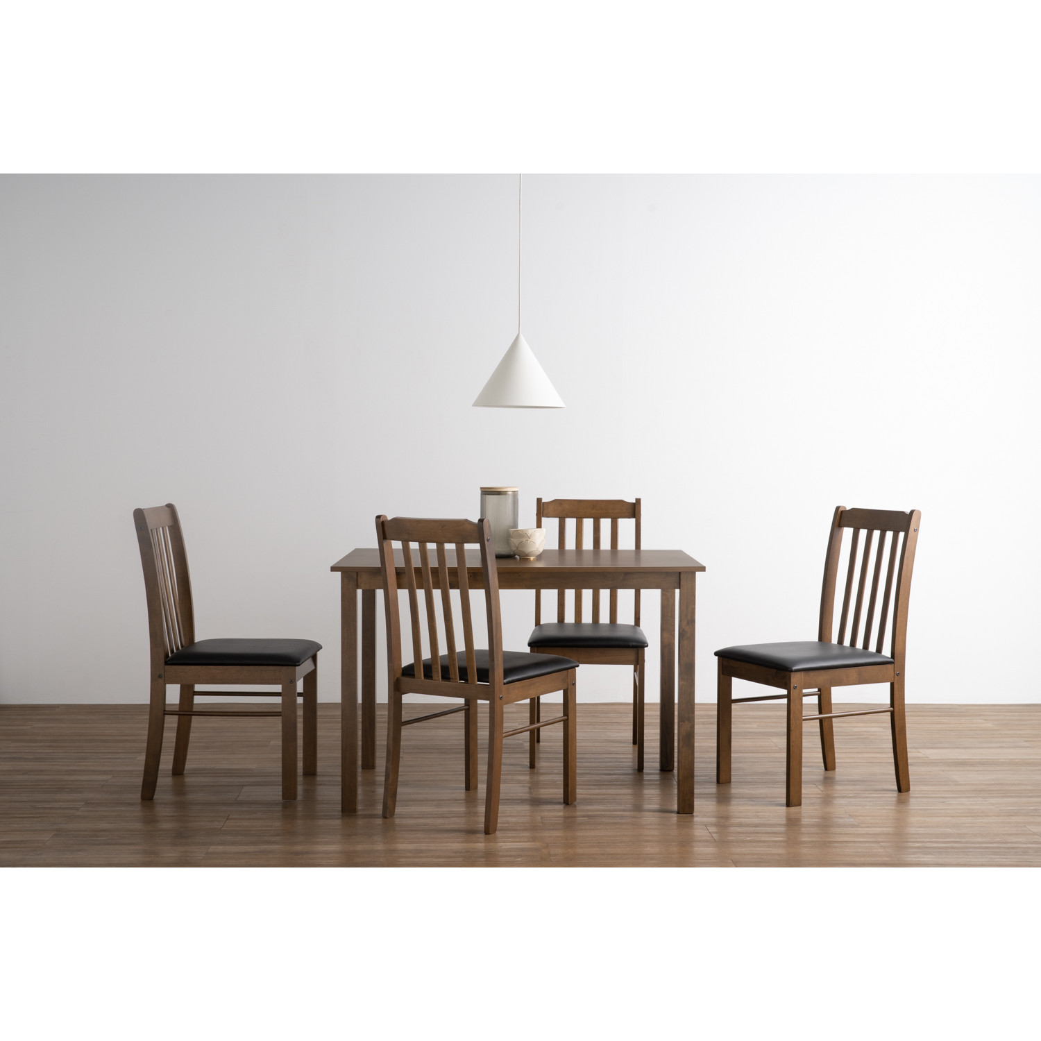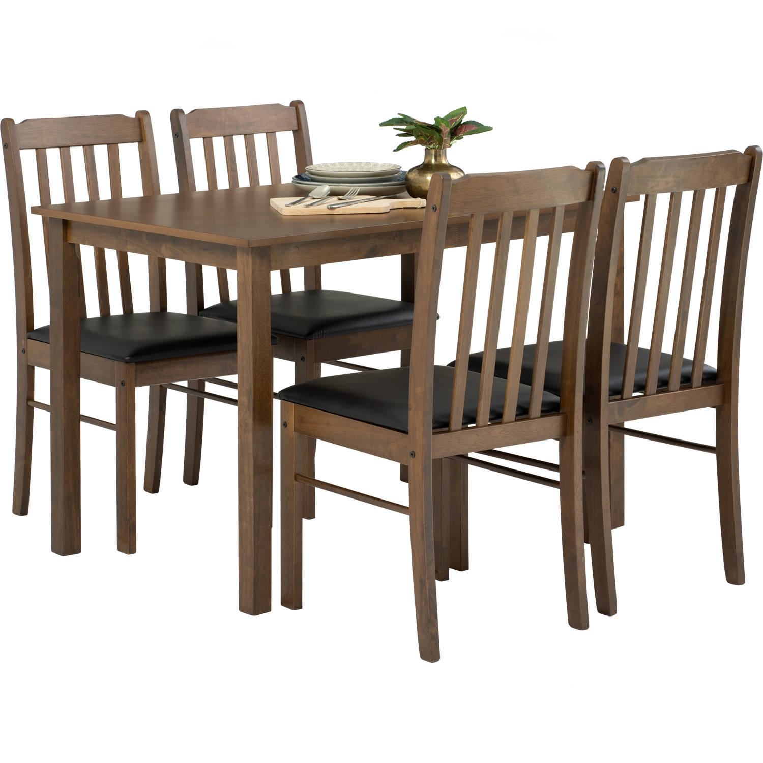Faye dining set 1+4 in Cocoa colour, Espresso colour Vinyl cushion seat. The Faye Dining Set combines rustic warmth with Mid-Century Modern simplicity. Featuring a sturdy Malaysian oak frame, the table showcases an MDF veneer top in cocoa tones for timeless appeal. Four matching chairs, crafted from oak with espresso vinyl seats, provide both comfort and durability. Its compact dimensions make it ideal for apartments or smaller dining spaces while still offering a welcoming presence. With a balance of natural texture and practical design, the Faye Set is a versatile choice for everyday meals and casual gatherings.