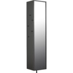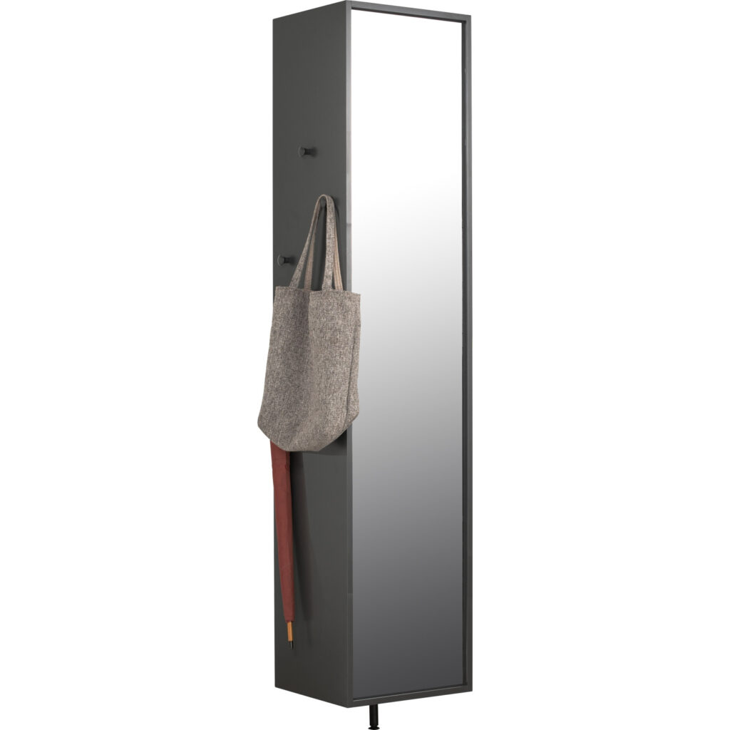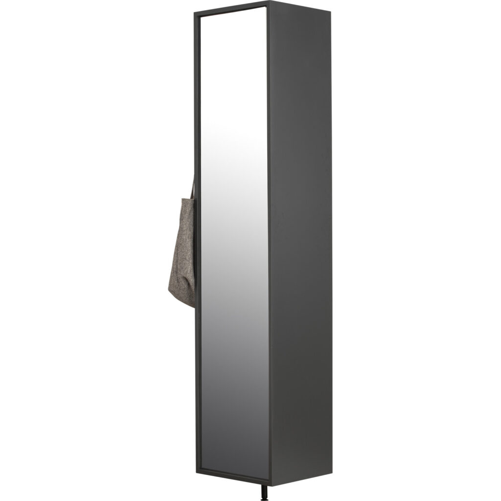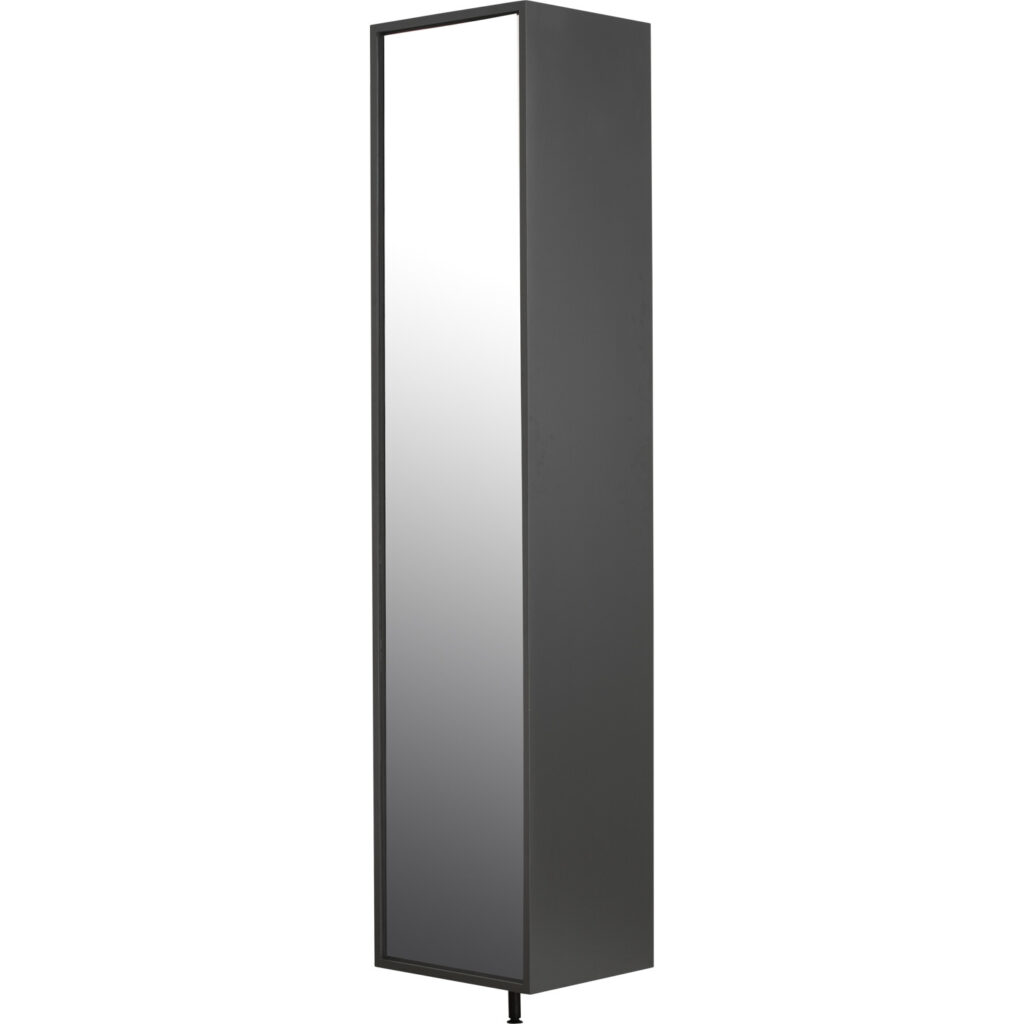 Felipe Shoe Cabinet with Mirror in Charcoal Grey lacquered. The Felipe Shoe Cabinet with Mirror combines sleek modern design with practical functionality. Constructed from MDF with a full-length mirror front, it serves as both a storage unit and dressing aid. Finished in Charcoal Grey Lacquer across its frame and legs, this slim vertical cabinet maximizes storage while fitting neatly into entryways or compact spaces.