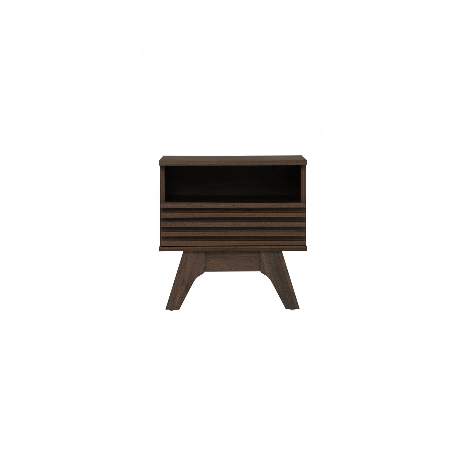 Floro side table in Walnut colour. The Floro Side Table blends Mid-Century Modern styling with Minimalist functionality, offering a versatile and durable accent piece. Made entirely from laminated board, it emphasizes clean lines and natural tones. Compact and practical, it serves well as a sofa companion, bedside table, or small accent in modern interiors. With its simple silhouette and everyday usability, the Floro Side Table is a timeless choice for contemporary living spaces.