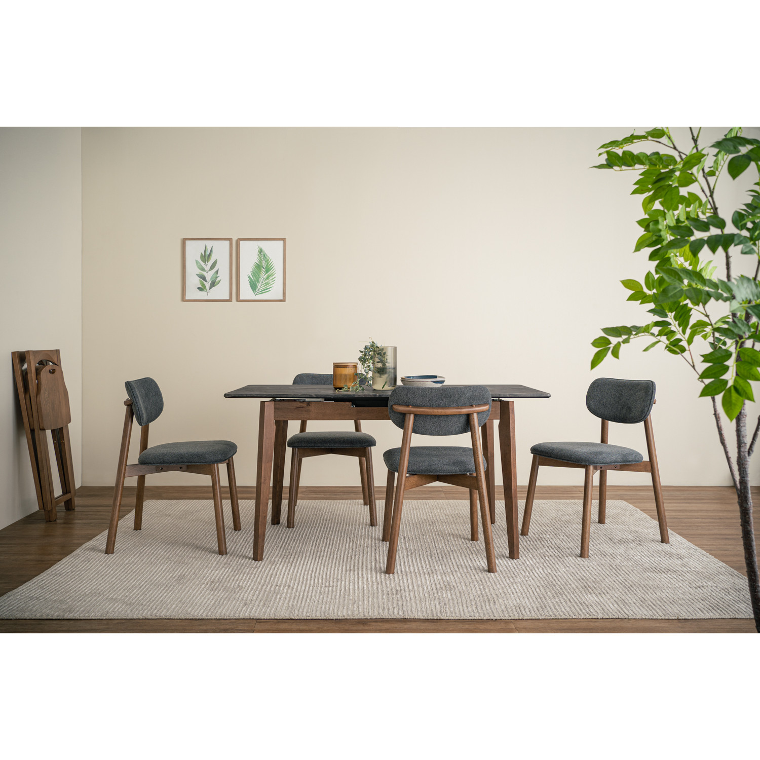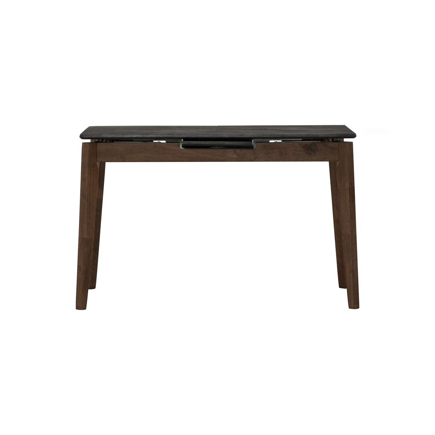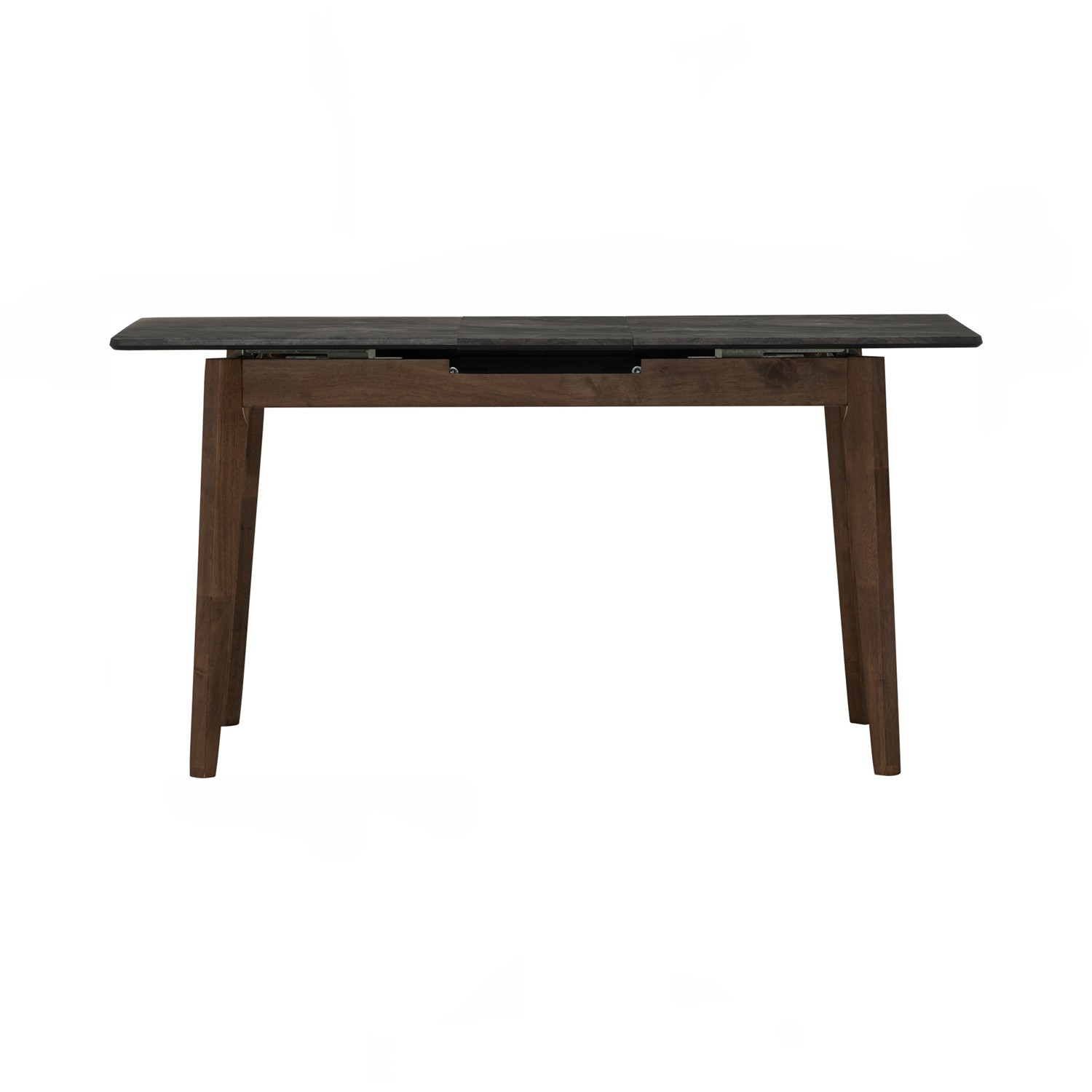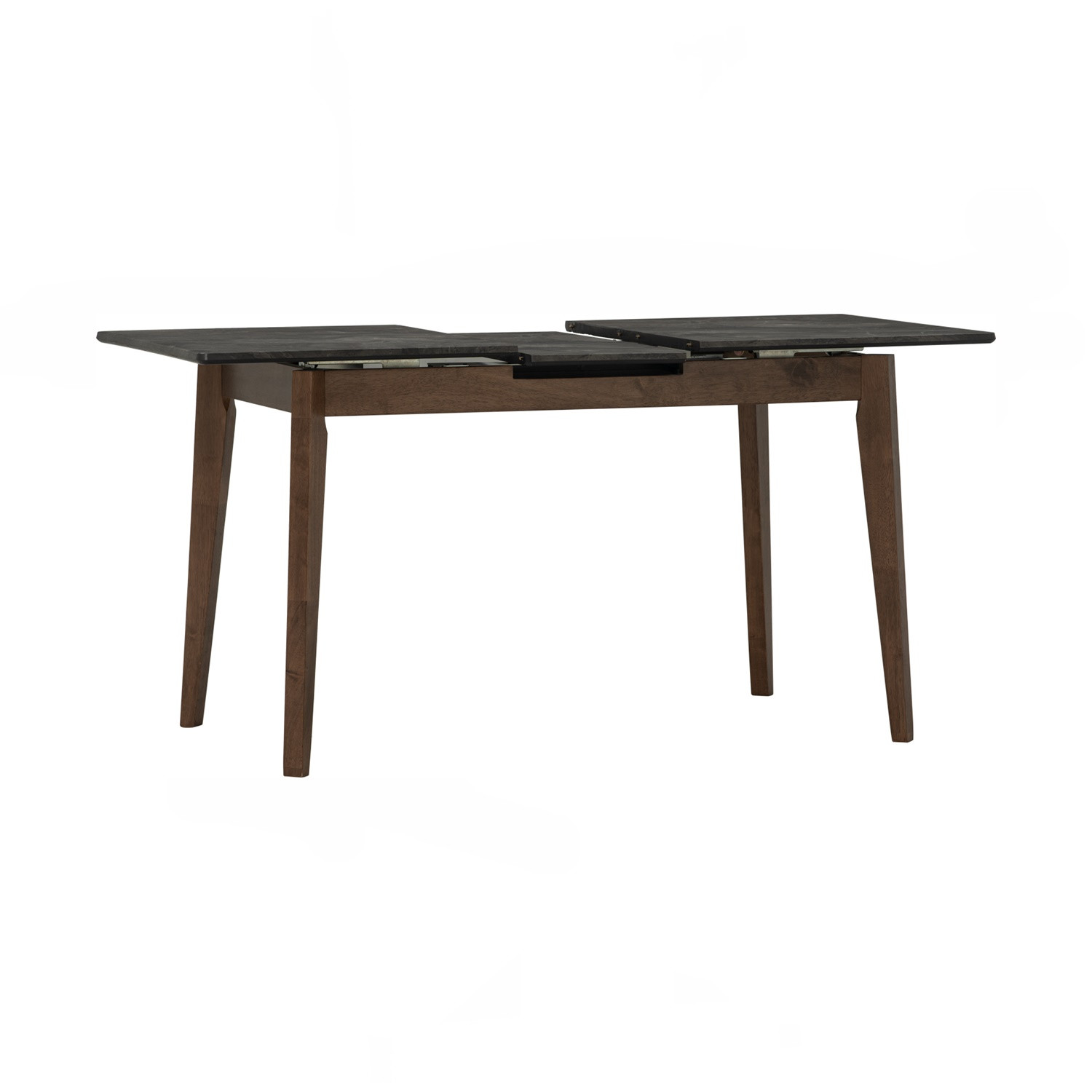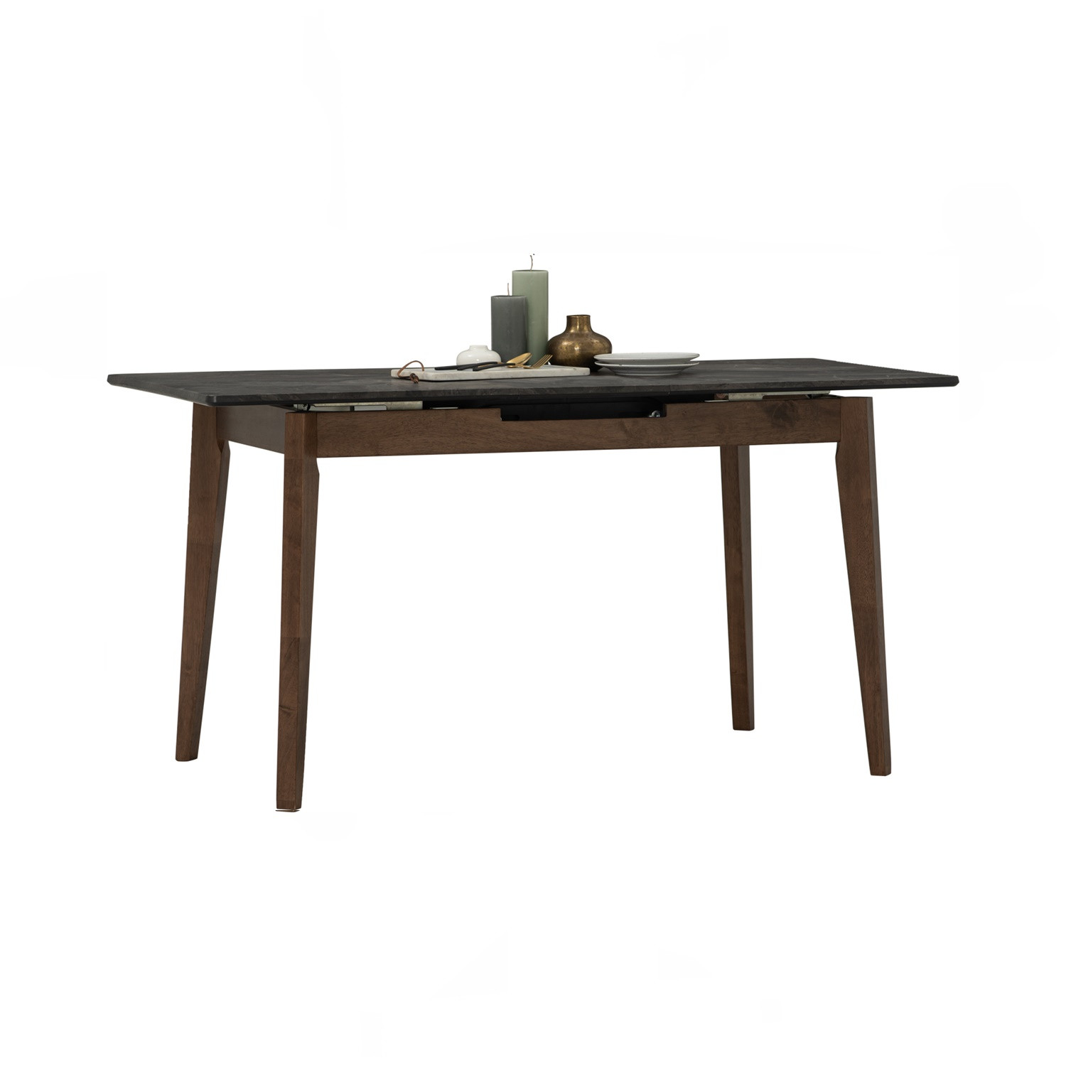 Folto 700×1200+300 extension table in Cocoa colour leg, Black Marble colour laminated top. The Folto Extendable Dining Table blends practicality with Mid-Century Modern elegance. Supported by cocoa-toned malaysian oak legs and topped with a marble-effect high-pressure laminate, it expands to provide extra seating when needed. A versatile and stylish dining solution.