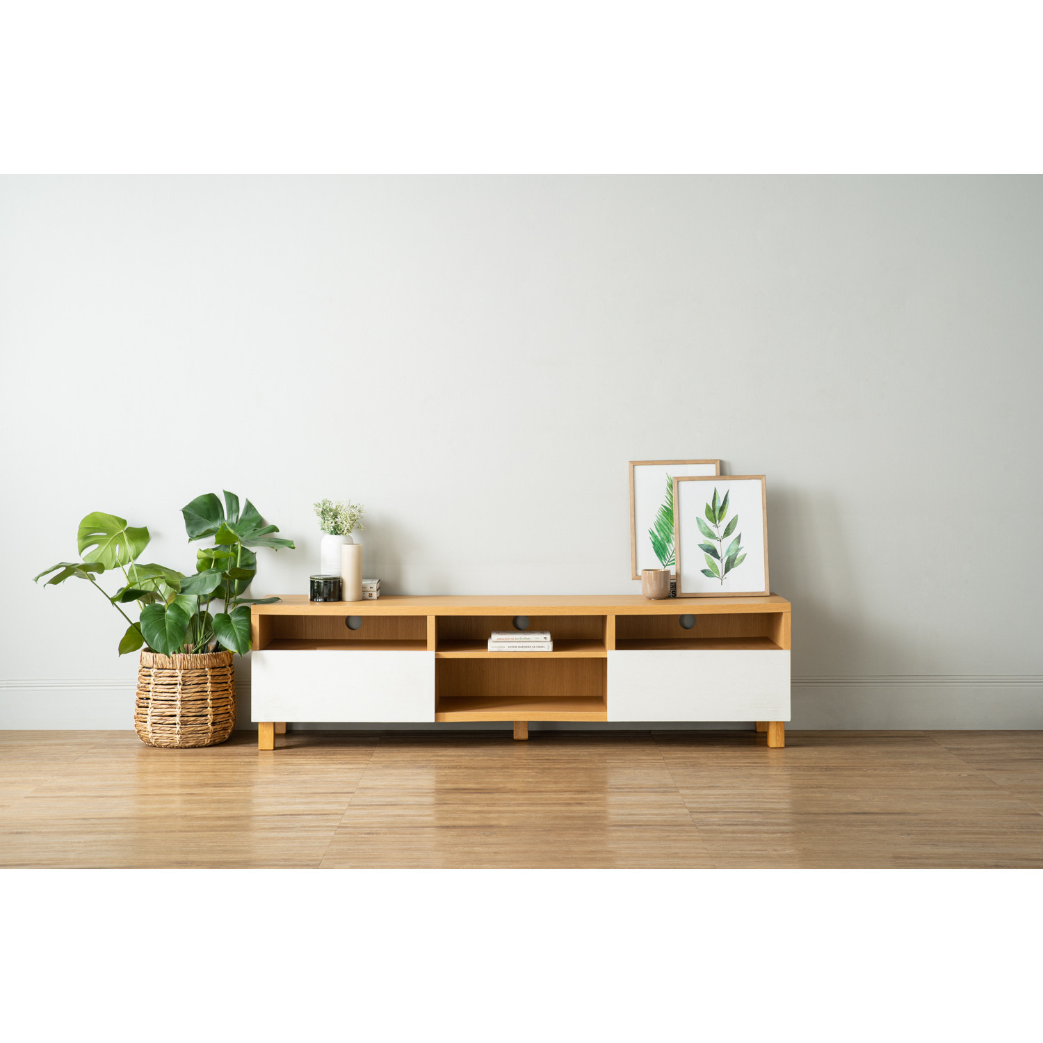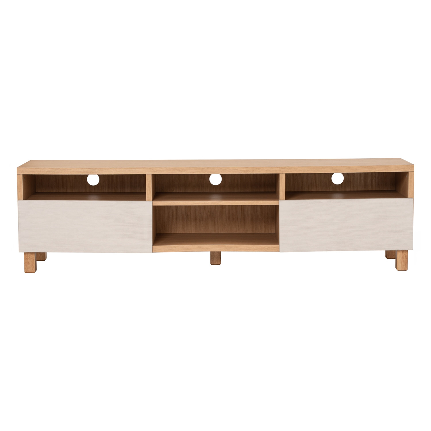 Gordy 1.78M TV cabinet in Oak laminate body with Light Grey laminate door with Natural colour leg. The Gordy 1.78M TV Cabinet brings minimalist Mid-Century Modern style into focus. It combines natural oak legs with an oak frame and light grey doors, creating a soft yet modern palette. Perfect for streamlined interiors, it provides ample storage while maintaining a clean, uncluttered appearance.
