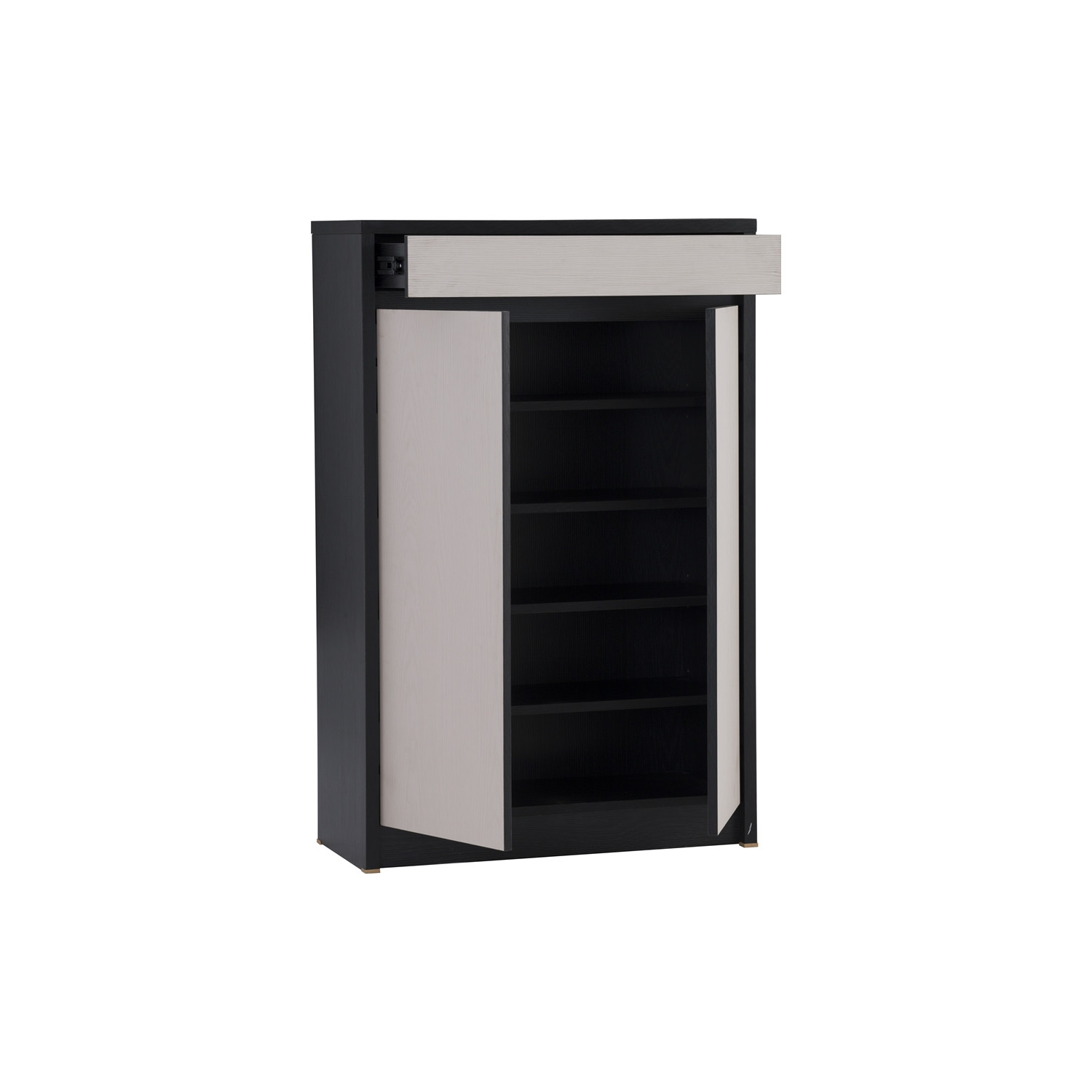 Habib 2 door shoe cabinet in Black laminate body and Light Grey laminate door. The Habib 2 Door Shoe Cabinet in black and light grey embodies a sleek modern style, offering compact storage with a contemporary aesthetic. Made from laminated board, its durable construction ensures practicality while the dual-tone finish adds visual interest. The black frame contrasts elegantly with the lighter doors, creating a balanced design that fits seamlessly in modern homes. Ideal for small entryways, it provides an organized solution for shoe storage without occupying much space. Both stylish and functional, the Habib cabinet is perfect for households seeking minimalist convenience.