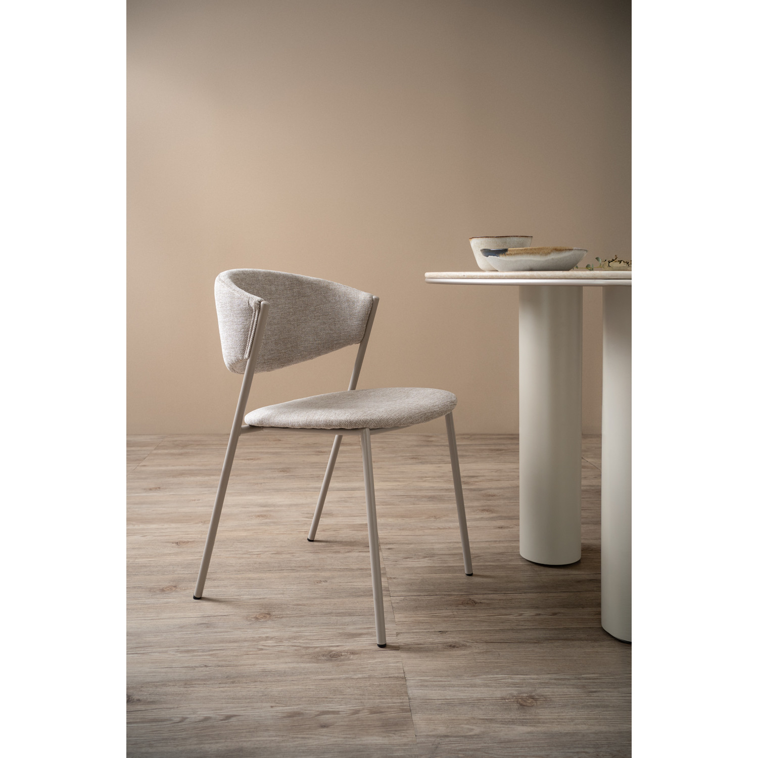 Kory dining chair in Matt Beige Epoxy colour leg, Beige colour Brego fabric. The Kory Dining Chair merges Mid-Century Modern charm with Modern versatility, designed to elevate both residential and commercial interiors. Supported by metal legs in a matte beige finish, the chair delivers strength while maintaining a clean, contemporary aesthetic. The Brego fabric seat in Beige provides soft comfort and a neutral tone that pairs effortlessly with various dining settings. Compact yet supportive, the Kory Dining Chair is ideal for modern dining spaces, offering timeless appeal and reliable function.