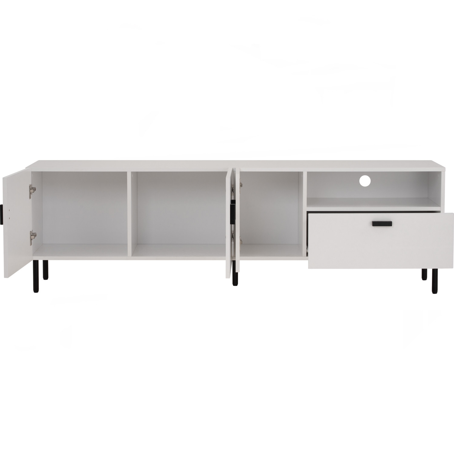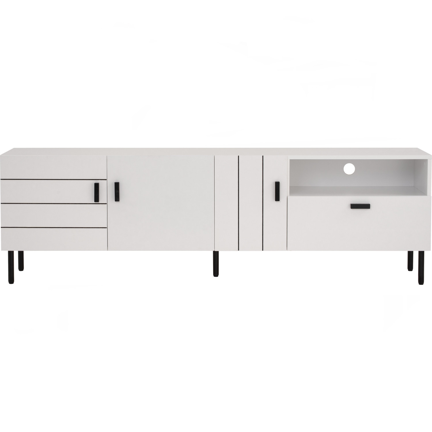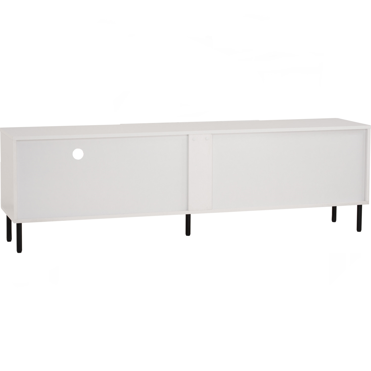 Kotka 1.8m tv cabinet in Matt Black Epoxy colour leg, White colour top. The Kotka 1.8M TV Cabinet combines black metal legs with a white melamine laminated body, creating a bold contrast. Sturdy and functional, it offers ample storage with a modern, streamlined silhouette. Its neutral tones ensure it blends easily into a variety of living spaces. A durable, best-value piece that enhances contemporary interiors.