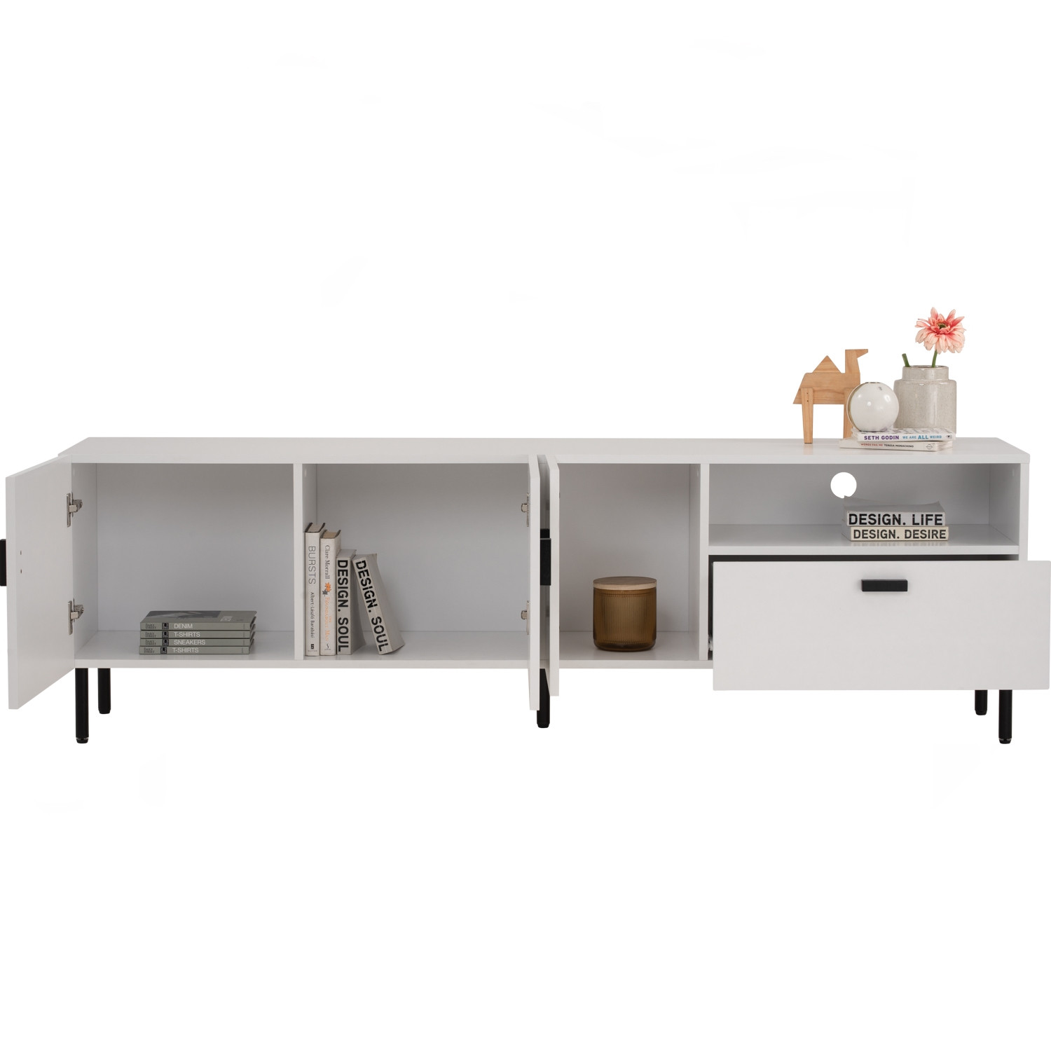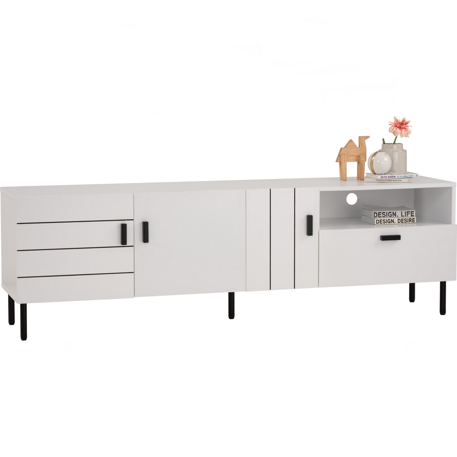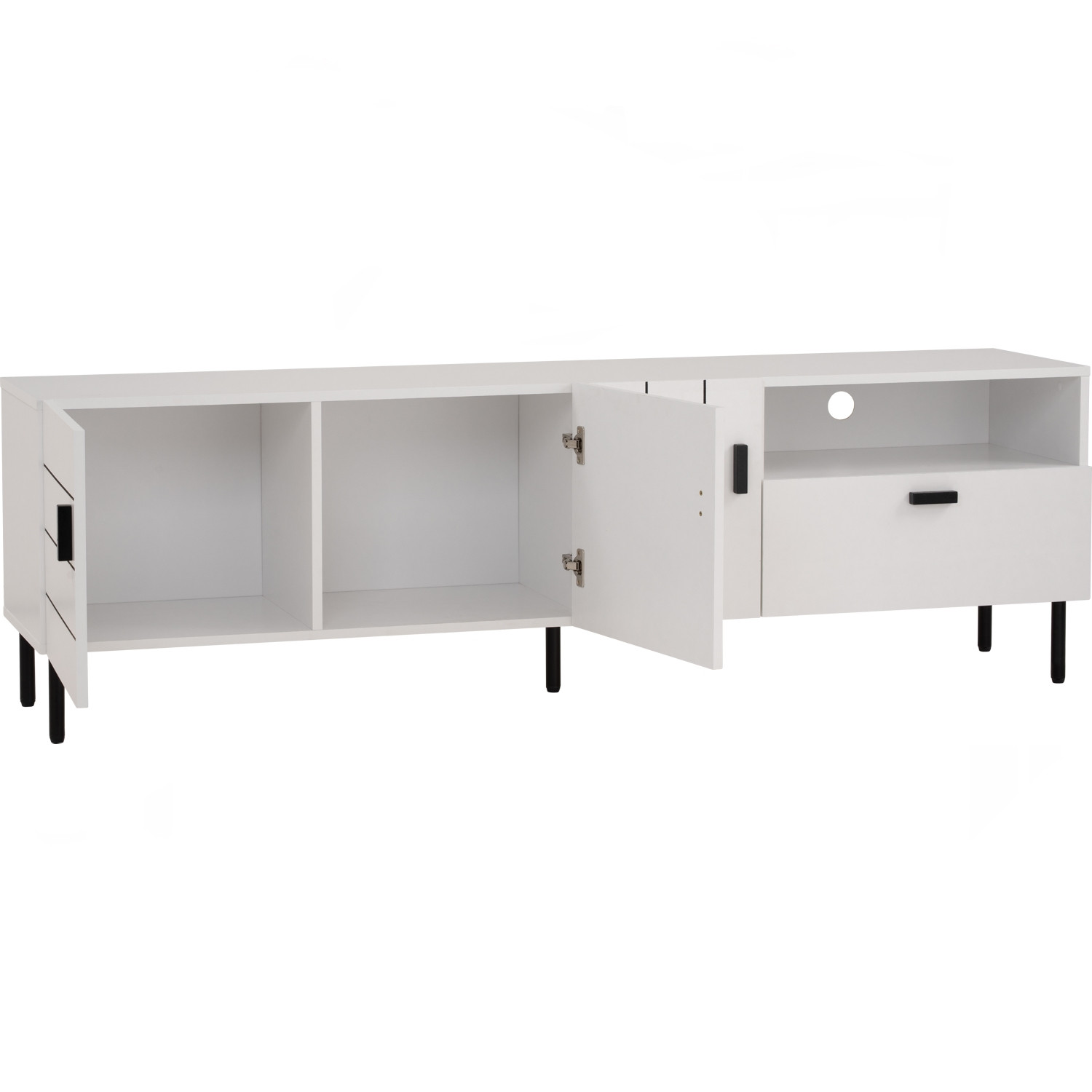 Kotka 1.8m tv cabinet in Matt Black Epoxy colour leg, White colour top. The Kotka 1.8M TV Cabinet combines black metal legs with a white melamine laminated body, creating a bold contrast. Sturdy and functional, it offers ample storage with a modern, streamlined silhouette. Its neutral tones ensure it blends easily into a variety of living spaces. A durable, best-value piece that enhances contemporary interiors.