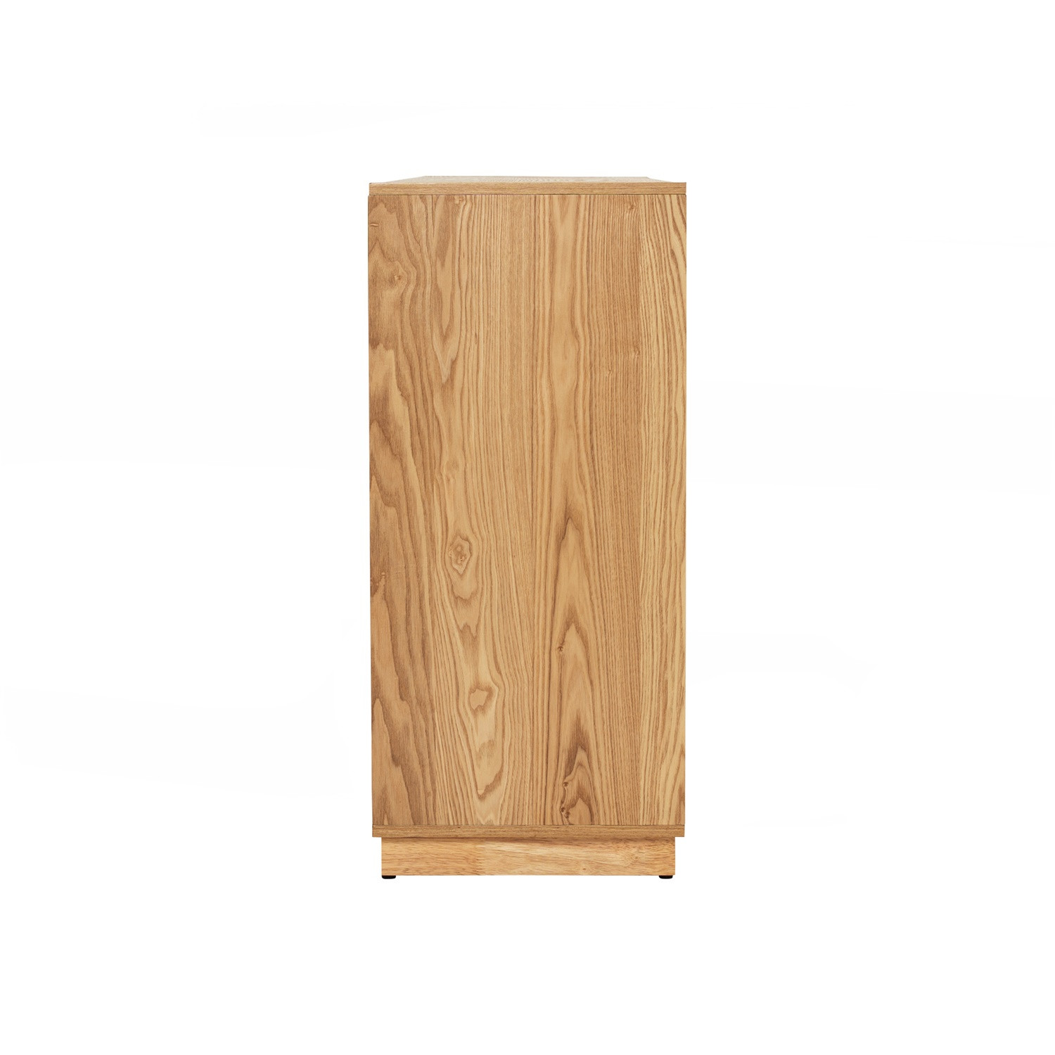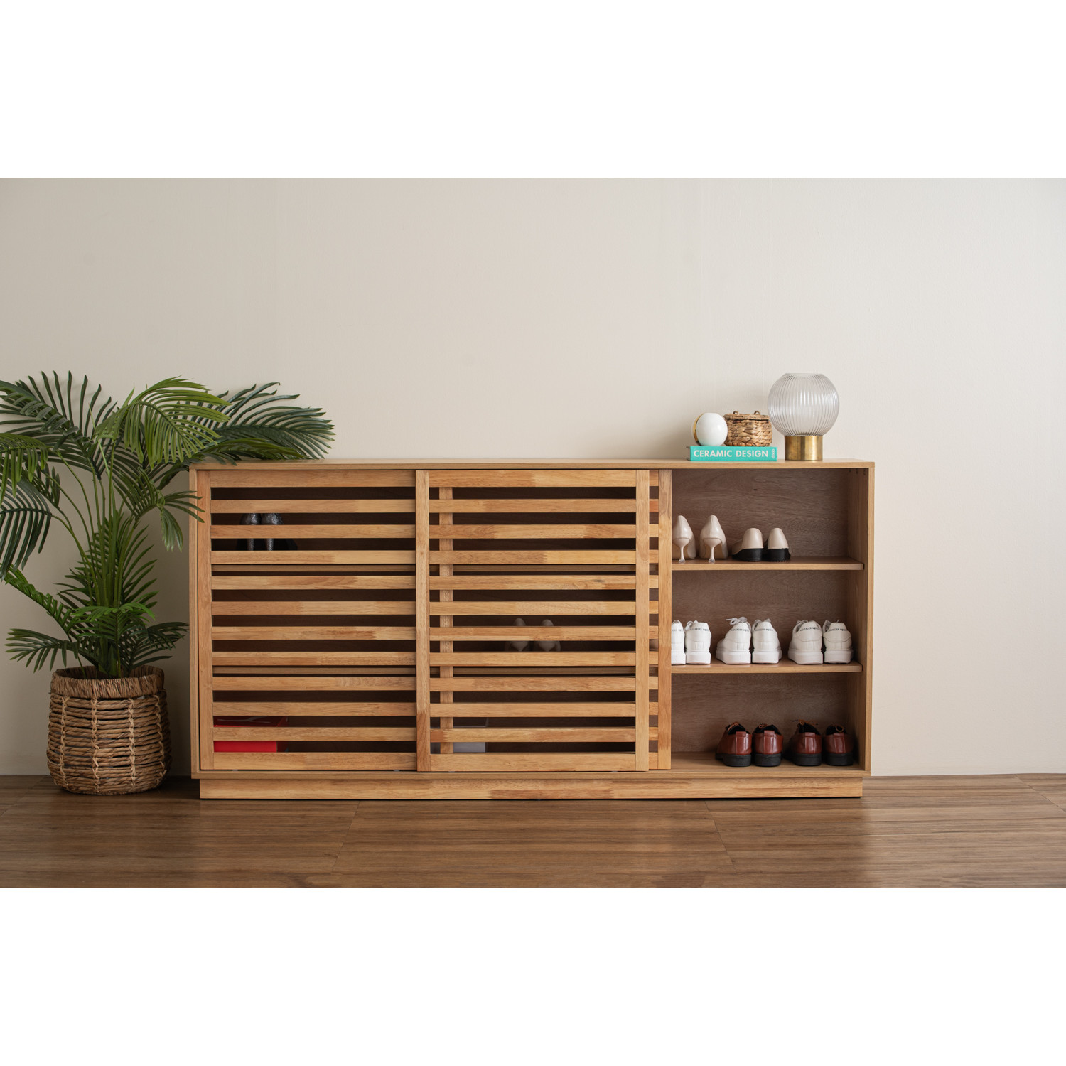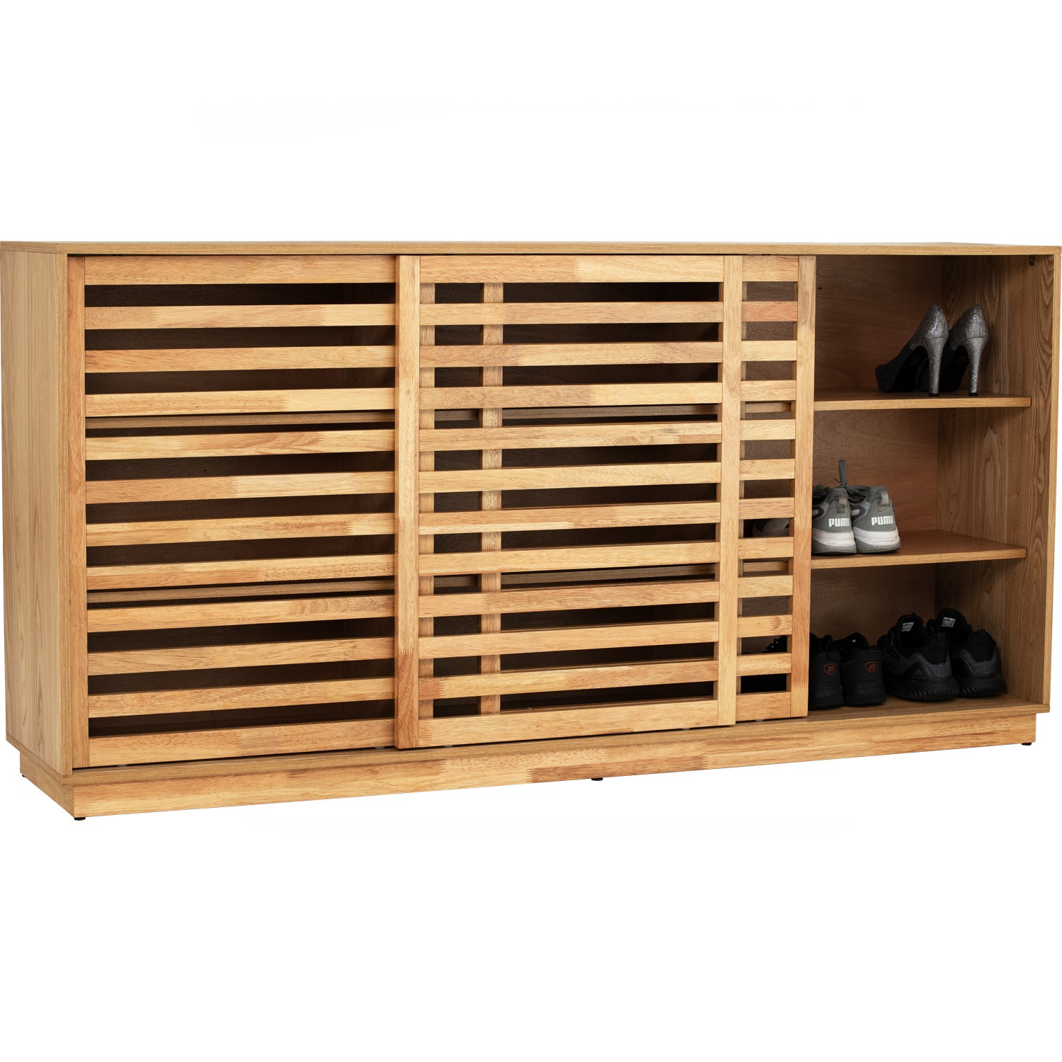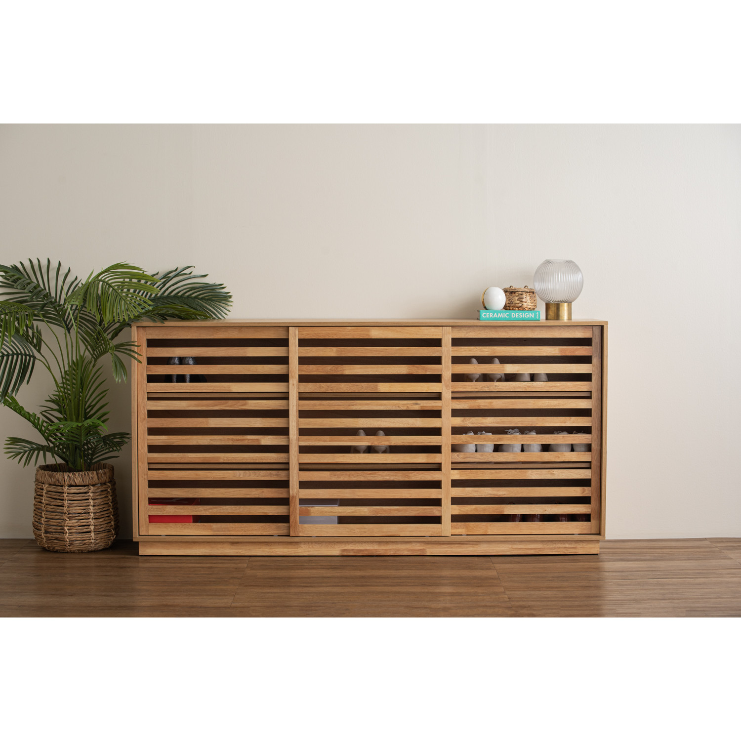 Kyoto 3 door shoe cabinet in Natural colour. The Kyoto 3 Door Shoe Cabinet reflects Japanese-inspired minimalism with its natural oak finish and understated design. Crafted from Malaysian oak with MDF and ash veneer, it offers durability and elegance in one. The three-door layout provides generous storage space, keeping shoes neatly organized and concealed. Its natural tones highlight organic beauty, making it an excellent fit for modern or Scandinavian interiors that value simplicity and functionality. With its clean lines and practical form, this cabinet combines timeless style with everyday utility, ideal for entryways or living spaces seeking calm and order.