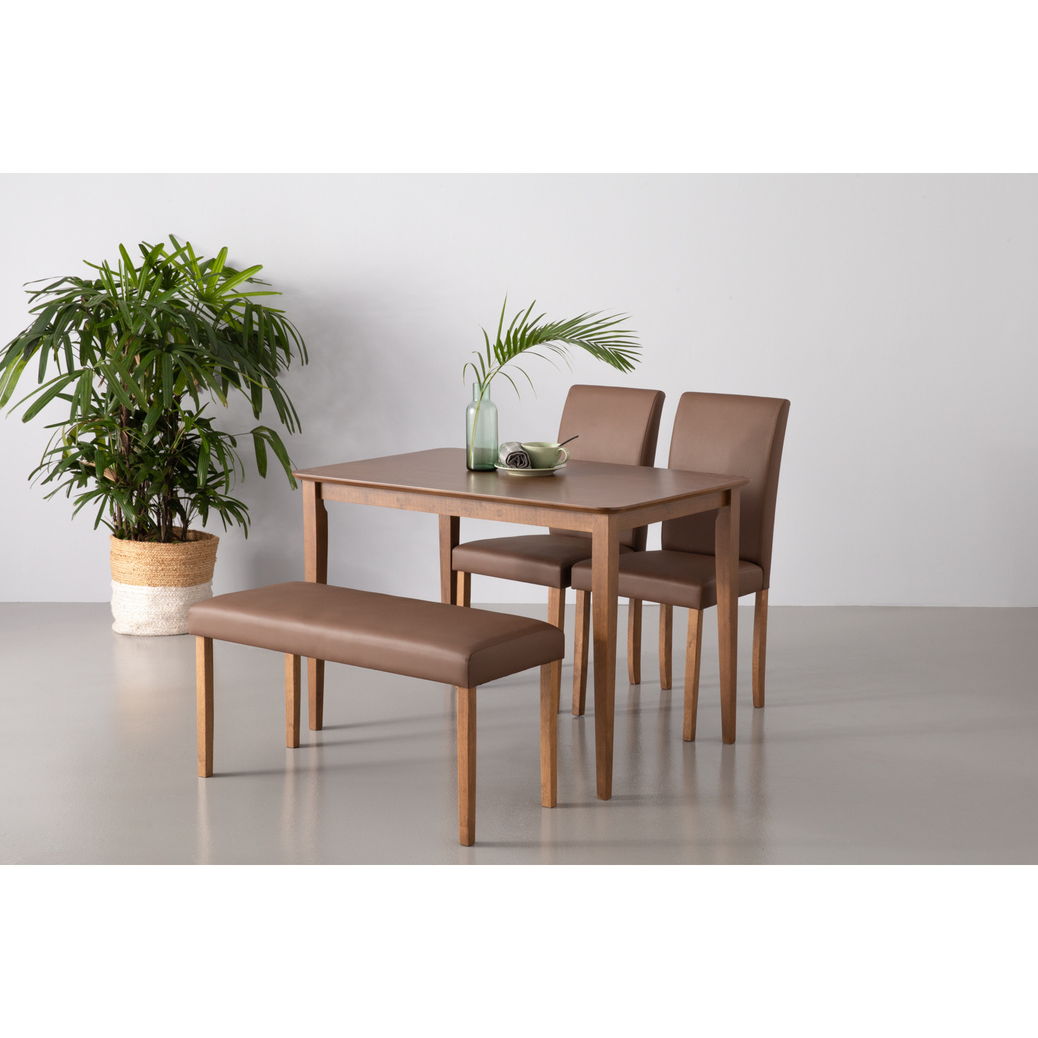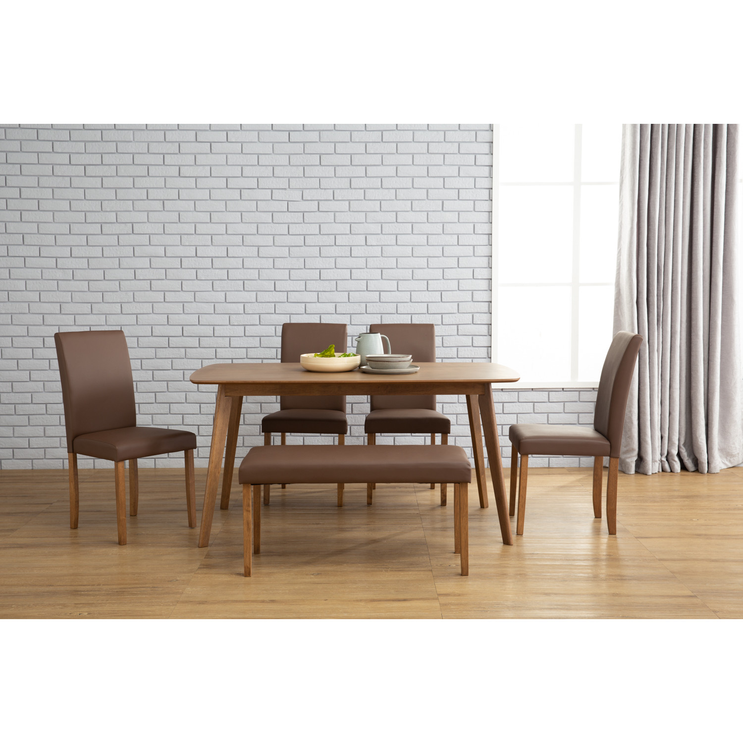 Lenore bench in Cocoa colour leg, Mocha colour Vinyl. The Lenore Bench Chair embodies Mid-Century Modern design with Minimalist functionality, providing a versatile seating solution. Supported by Malaysian oak legs in a Cocoa finish, the bench offers durability and a warm, natural aesthetic. Upholstered in vinyl in Mocha, the seat delivers both comfort and easy maintenance, making it suitable for daily use. With its elongated form and compact design, the Lenore Bench Chair is ideal for dining areas, entryways, or hospitality spaces. It is a practical and stylish addition that balances simplicity with elegance.