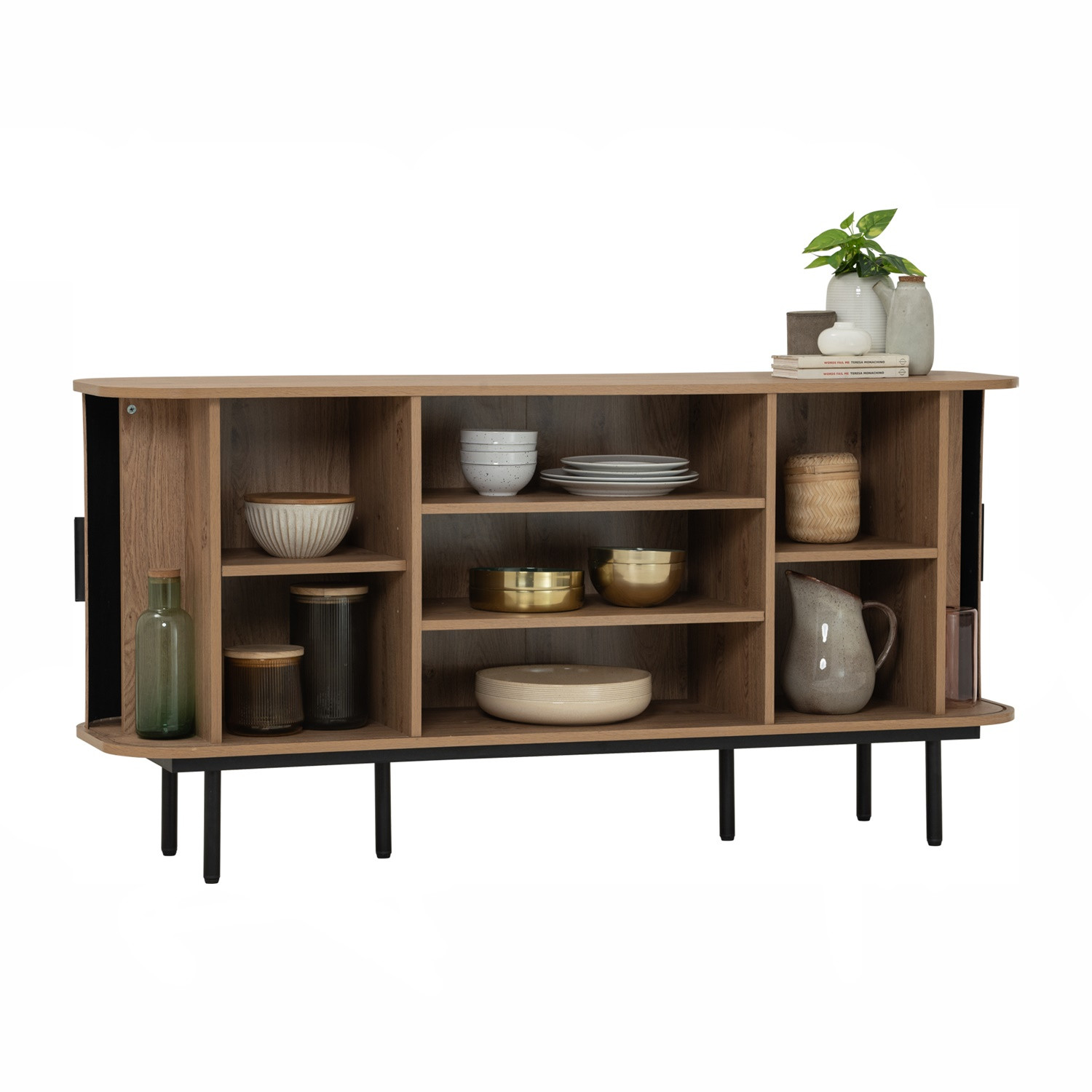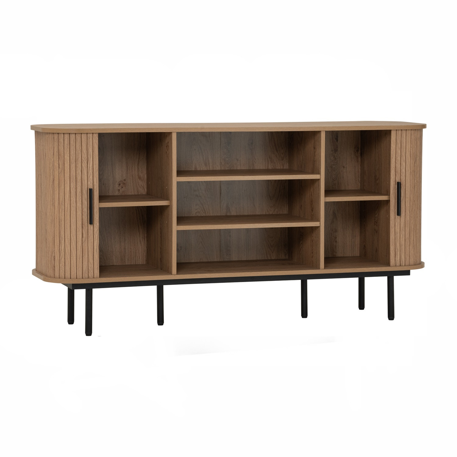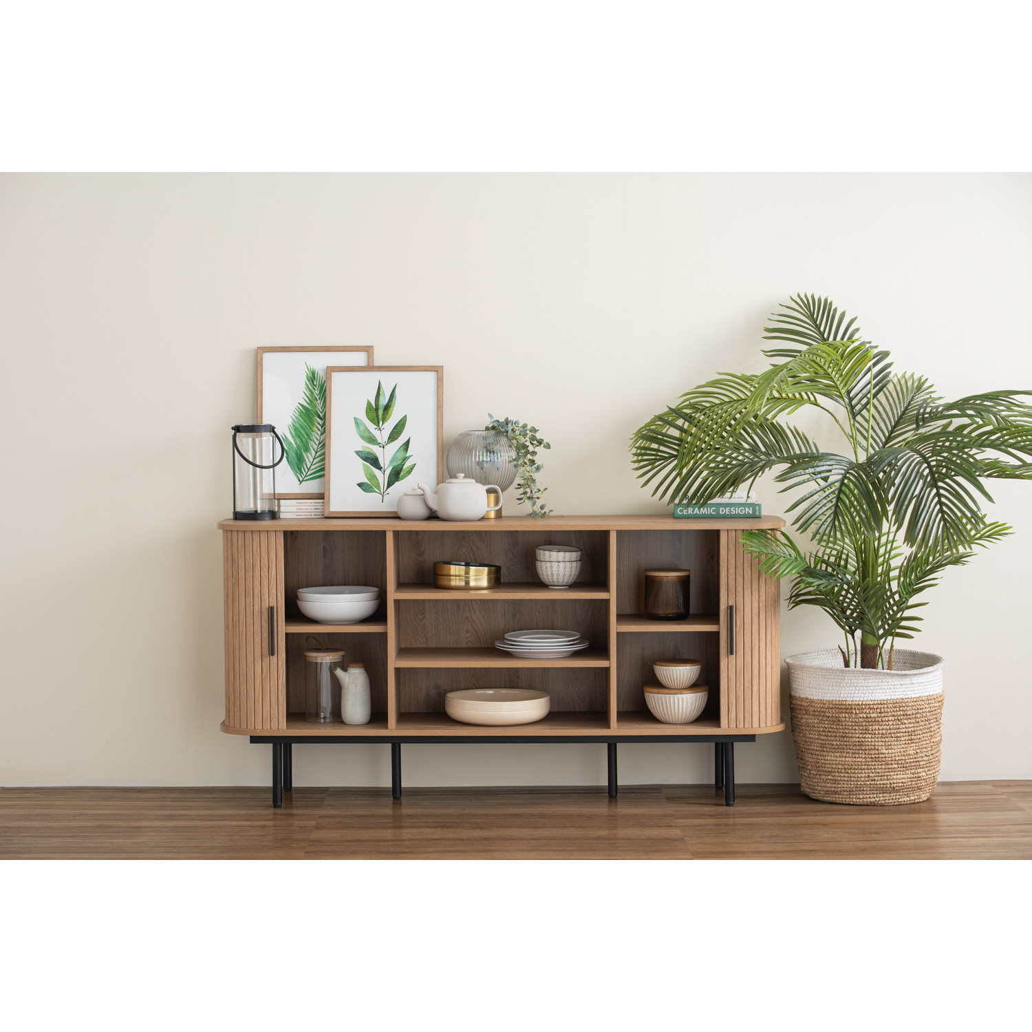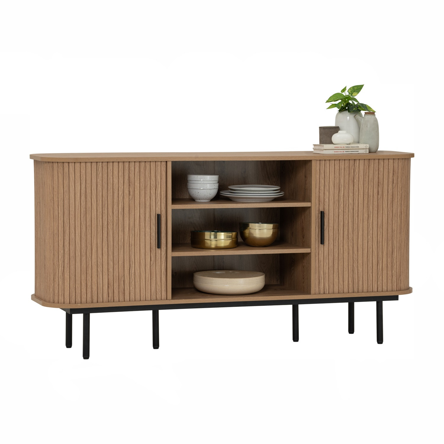 Malmo 1.5m sideboard in Matt Black Epoxy leg, Oak colour body. The Malmo Sideboard offers a sleek Scandinavian-modern style, featuring a laminated oak body supported by slim black metal legs. Its minimalist design creates a refined silhouette that complements both modern and urban-inspired interiors. The oak finish adds warmth and texture, balancing the clean lines with natural charm. Offering practical storage within a compact frame, the Malmo is perfect for smaller dining rooms or living spaces while maintaining style and function. A versatile piece, it blends durability with contemporary elegance, making it an ideal choice for homes seeking simplicity and sophistication.