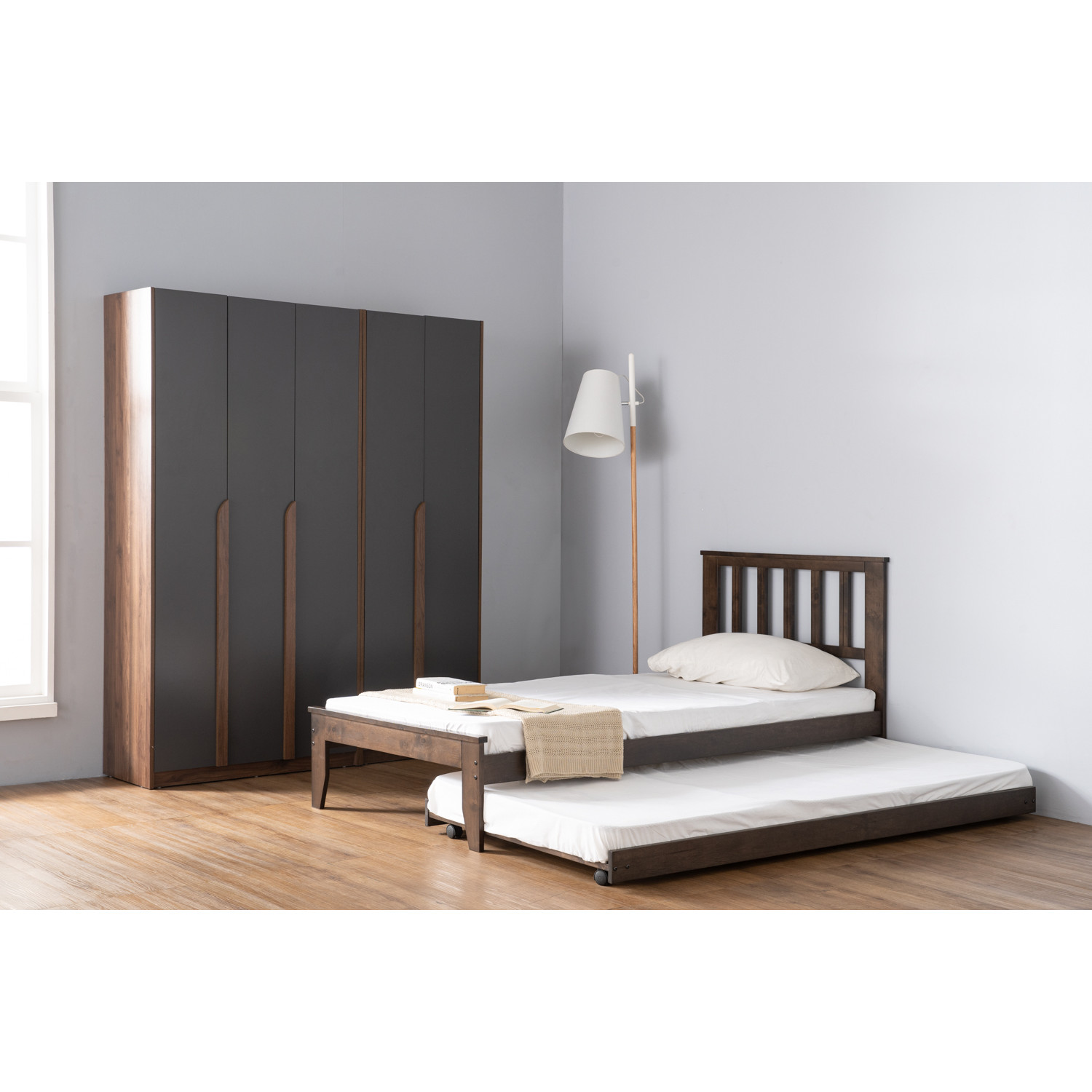 Mando 2 door wardrobe in Walnut colour body and handle, Black colour door. The Mando 2 Door Wardrobe reflects a modern minimalist style, featuring a walnut laminated body accented with sleek black doors and handles. Its clean design creates a contemporary look, while the dark tones provide sophistication and warmth. Compact yet practical, it offers well-organized storage for clothing and essentials, making it suitable for bedrooms with limited space. The balanced contrast of walnut and black allows it to blend seamlessly with modern interiors while adding subtle elegance. Durable laminated board construction ensures easy maintenance, making the Mando wardrobe a stylish and practical solution for everyday living.
