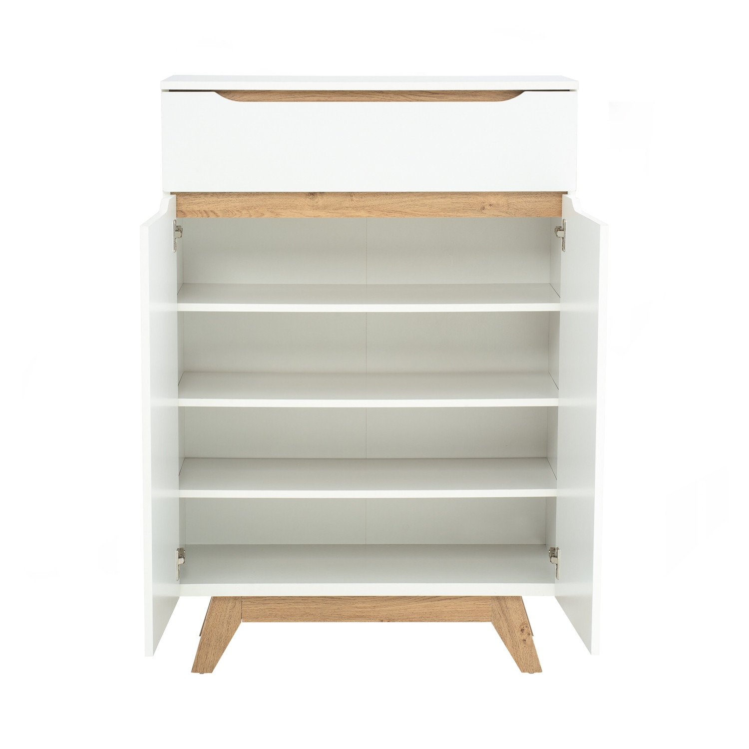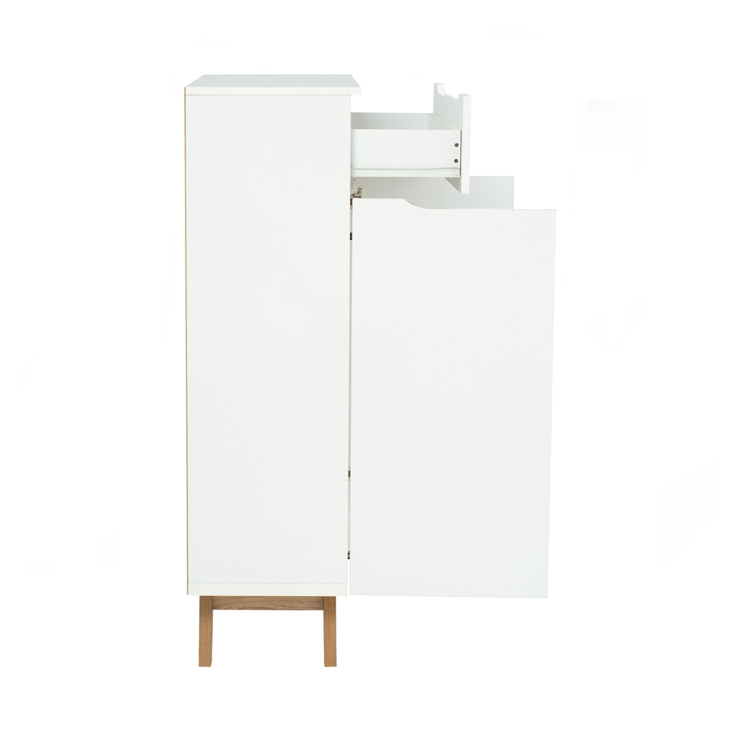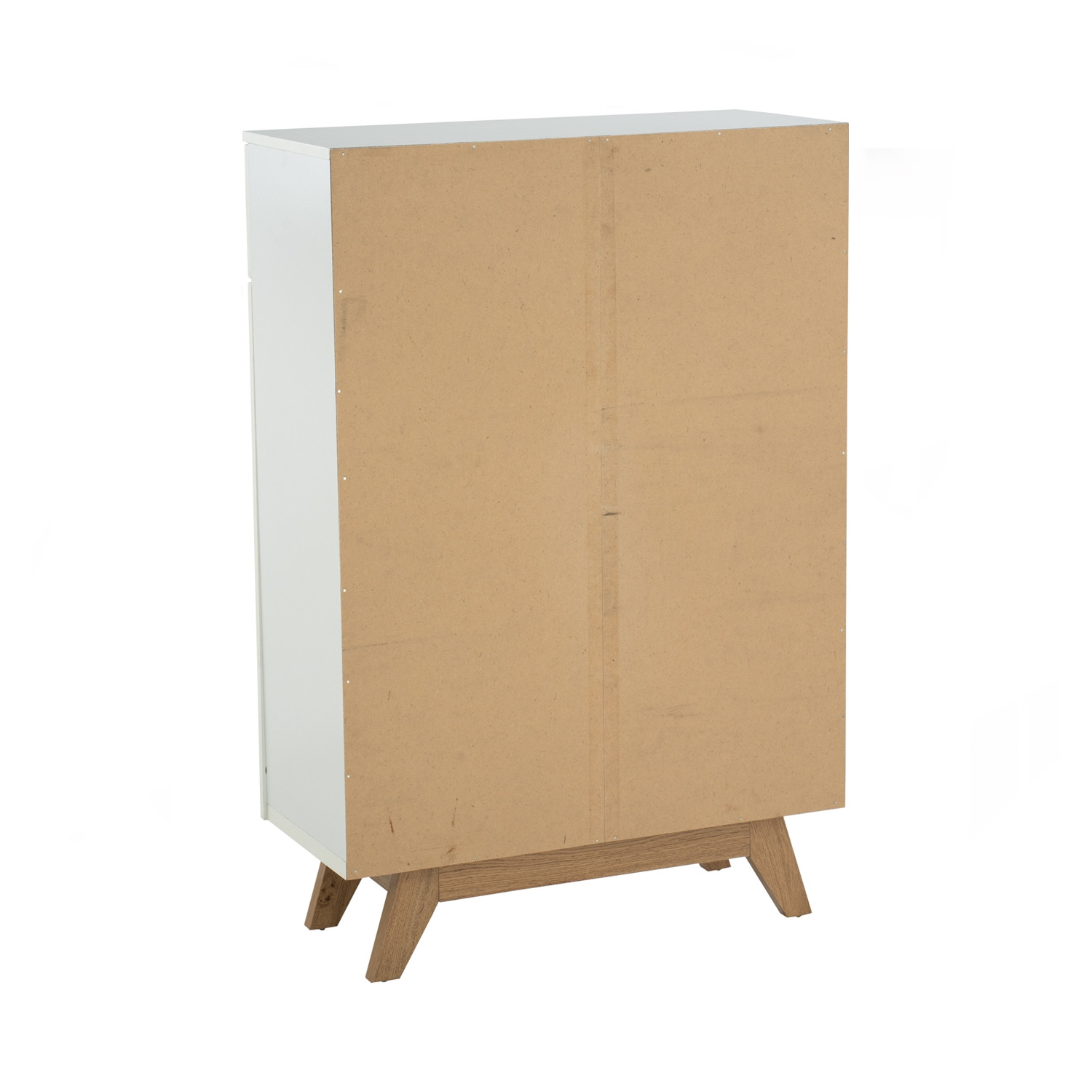 Mando multi function cabinet in Oak colour leg, White colour top (MB paper). The Mando Multi Function Cabinet embodies Scandinavian-inspired simplicity with its oak and white finish. Built from laminated board, it pairs natural oak legs with a crisp white cabinet body, creating a light and airy look. Its design emphasizes clean lines and practical storage, perfect for modern homes aiming for a clutter-free environment. Compact yet functional, this cabinet provides versatile storage for everyday essentials while enhancing the aesthetic of living rooms, bedrooms, or entryways. Its Scandinavian style makes it a timeless storage solution blending natural warmth with minimal elegance.