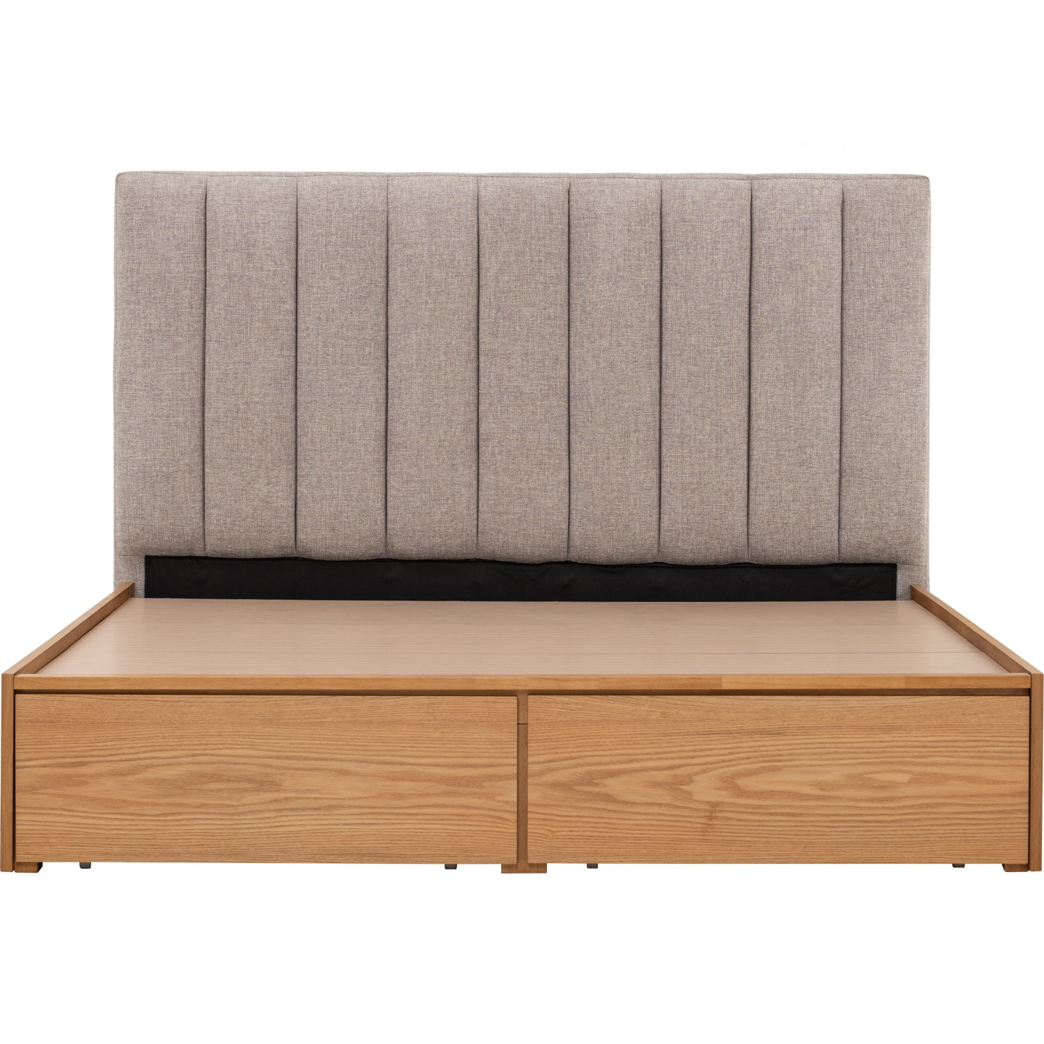 Mola Queen Bed with storage on Natural colour body, Greymist colour Belfast fabric (Fit mattress: 1530mm x 1930mm). The Mola Queen Bed with storage blends Mid-Century Modern appeal with rustic craftsmanship. Built with MDF and ash veneer, its sturdy storage system provides both function and elegance. The headboard, upholstered in Greymist Belfast fabric, introduces texture and sophistication. The natural oak finish of the storage base adds warmth and durability. Sized to fit a 1530 x 1930mm mattress, it balances comfort with practicality. Its seamless storage integration makes it ideal for modern homes with space-saving needs. Mola delivers both contemporary design and everyday utility.