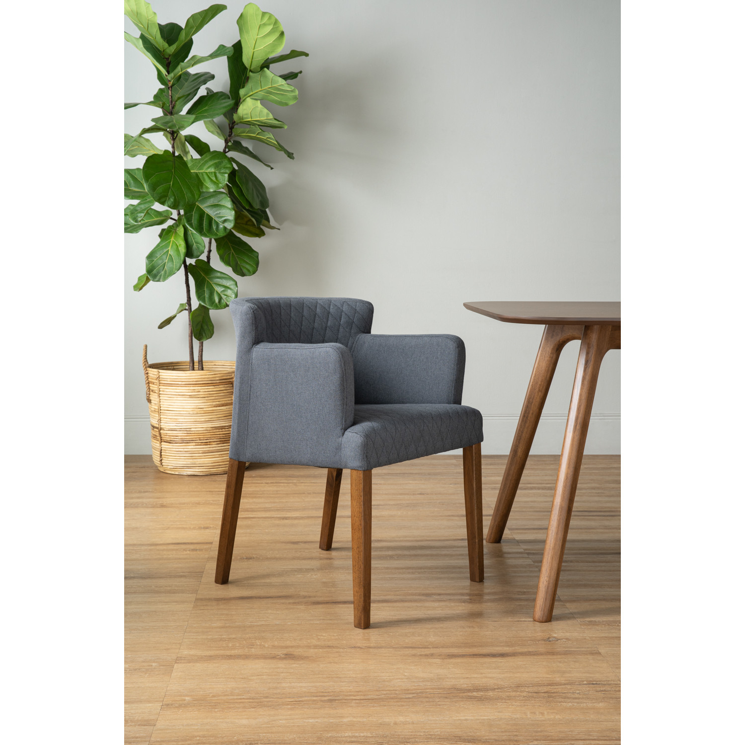 Rhoda arm chair with Cocoa colour leg, Hale Blue colour Double fabric seat & back. The Rhoda Arm Chair in cocoa oak pairs deep tones with refined design. Upholstered in navy fabric, it strikes a balance between boldness and sophistication. The armrests provide additional comfort, making it suitable for extended dining sessions. Built from Malaysian oak, it guarantees strength and longevity. An excellent choice for those who value both function and style in dining furniture.