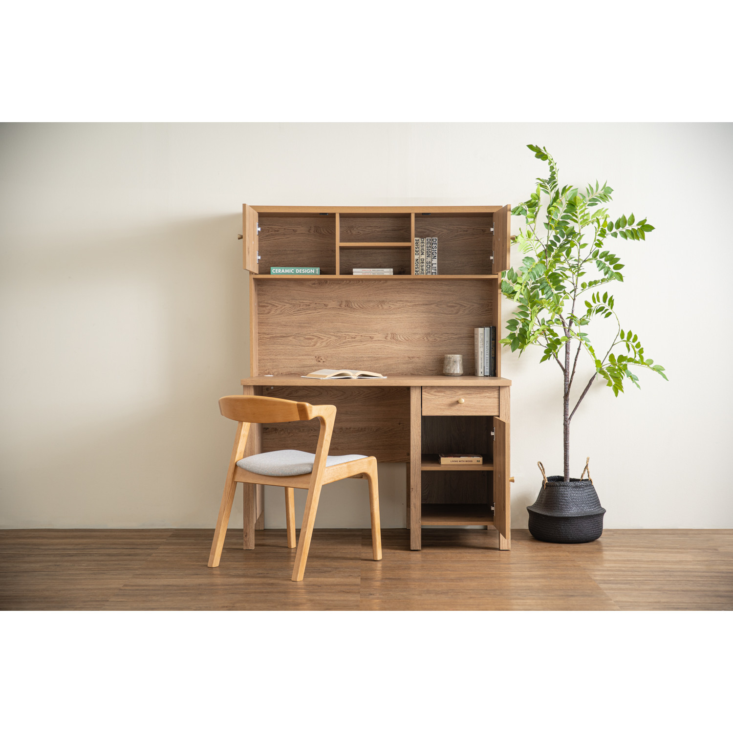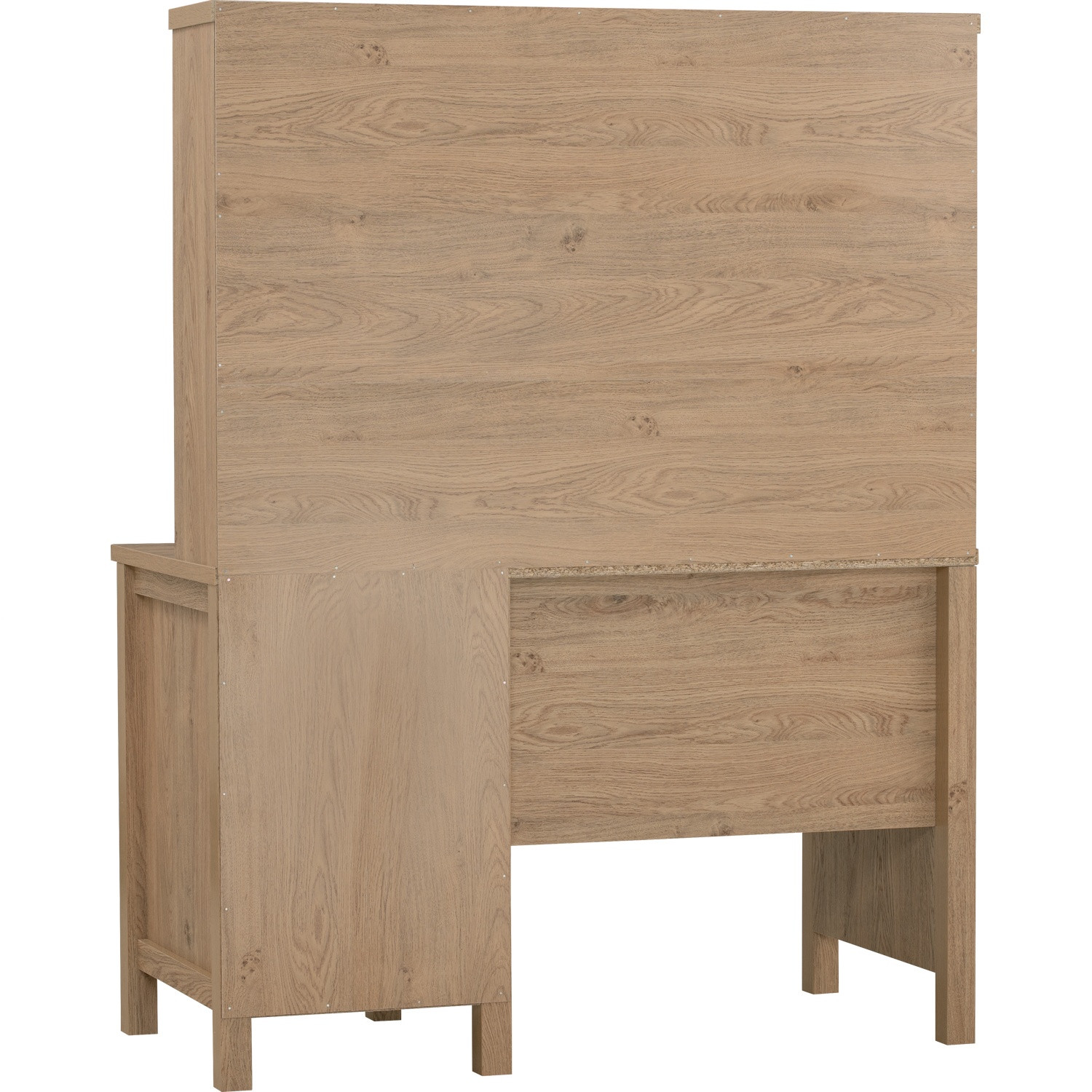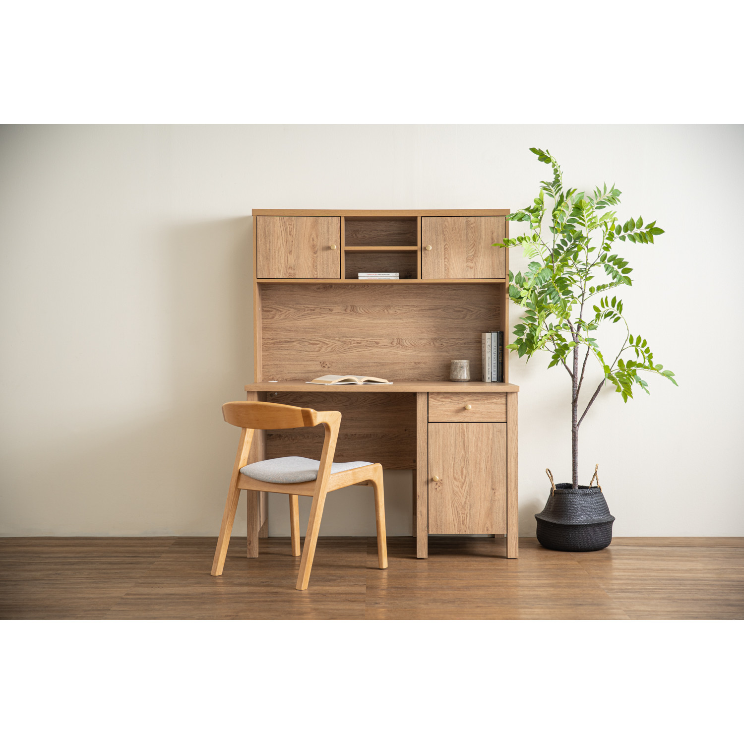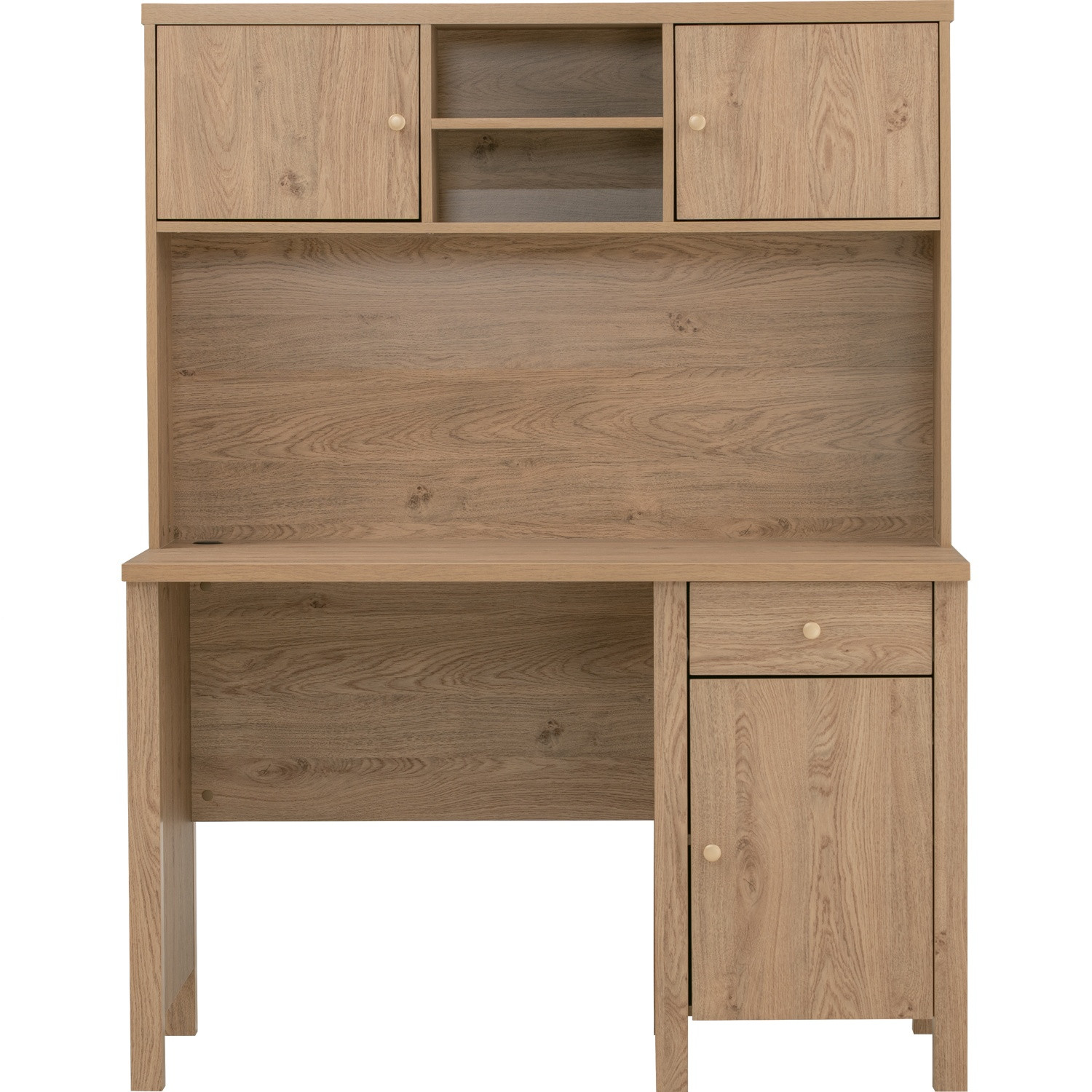 Rhodes working desk in Oak colour. The Rhodes Working Desk captures Rustic authenticity infused with Mid-Century Modern simplicity, making it a versatile addition to home or office spaces. Constructed entirely from laminated board, it offers durability and a warm, natural appearance. Its tall, structured form provides both workspace and functional storage, supporting modern lifestyle needs. Designed with clean proportions and a timeless aesthetic, the Rhodes Desk adapts easily to different interiors. It is an ideal solution for those seeking a practical workstation with rustic character and modern appeal.