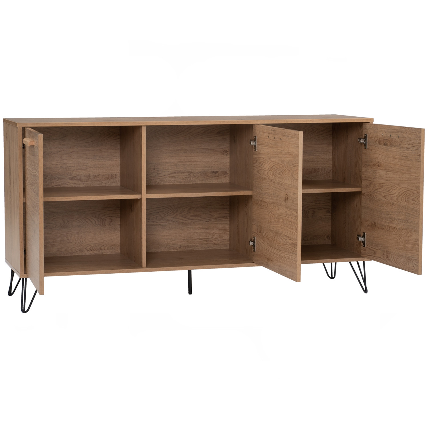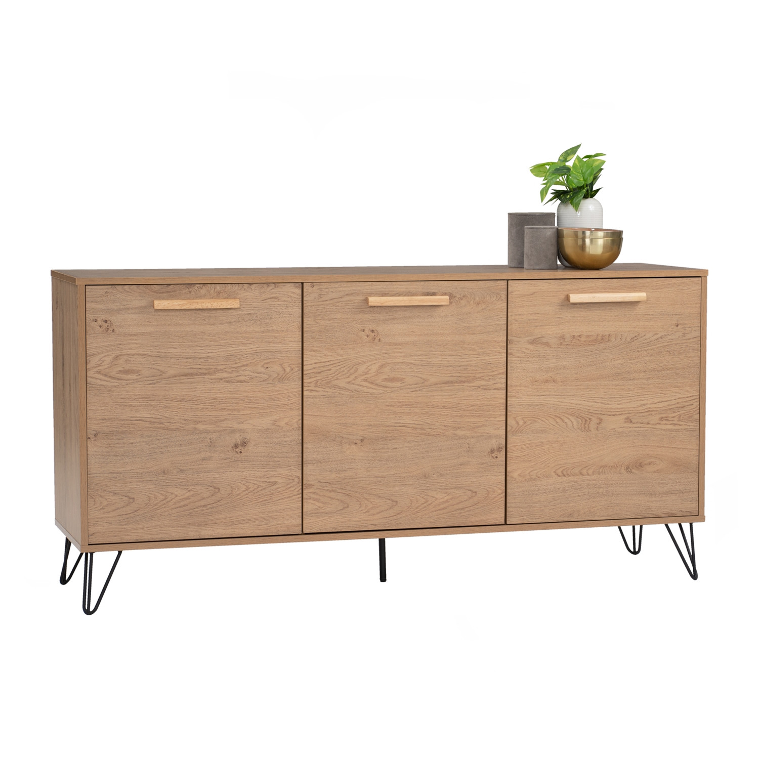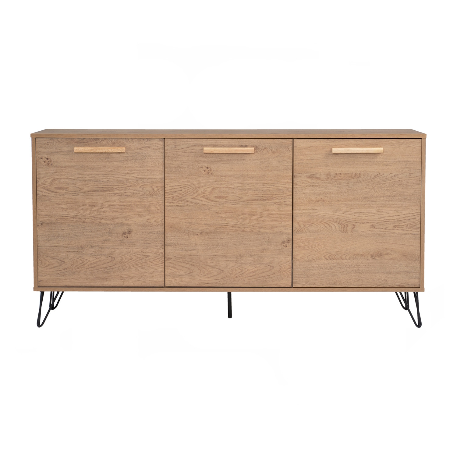 Samos 1.49m sideboard in Matt Black Epoxy colour leg, Oak colour top. The Samos 1.49M Sideboard embodies Industrial-inspired design, pairing a laminated oak body with matte black metal legs for a striking contrast. Its extended frame provides ample storage space, making it ideal for dining rooms, living spaces, or multipurpose areas. The warm oak finish adds a natural touch, while the slim black frame brings contemporary edge and stability. With its balanced mix of durability, function, and style, the Samos Sideboard enhances modern and rustic-inspired interiors alike. A practical best-value cabinet for those seeking both charm and everyday usability.