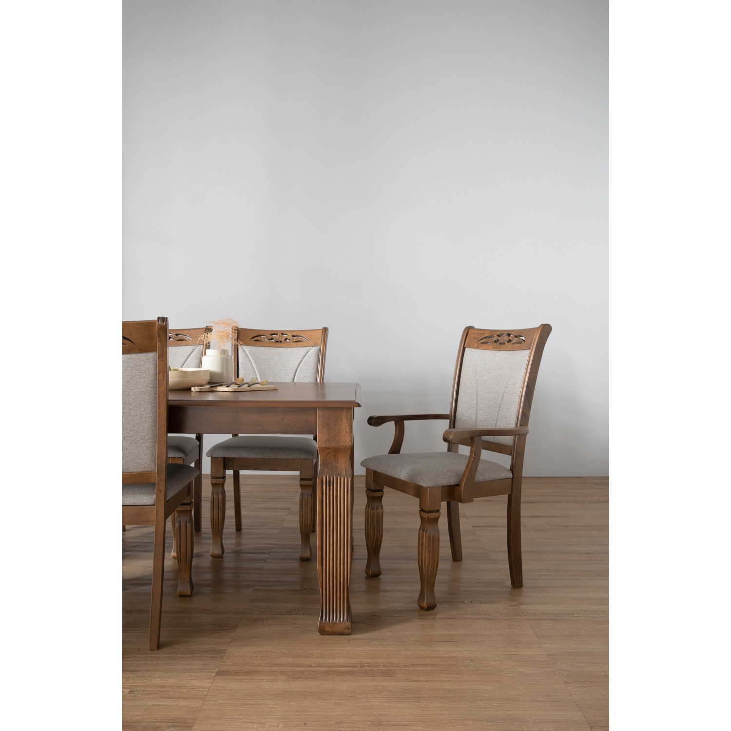 Tegus arm chair in Cocoa colour frame, Dolphin colour Dimity fabric. The Tegus Arm Chair captures Rustic warmth with Mid-Century Modern sophistication. Malaysian Oak legs in a cocoa finish provide a strong foundation, while the dimity fabric seat and backrest add comfort and elegance. With gently curved armrests and a tall, supportive back, this chair is both practical and refined, making it suitable for dining spaces or statement seating areas.