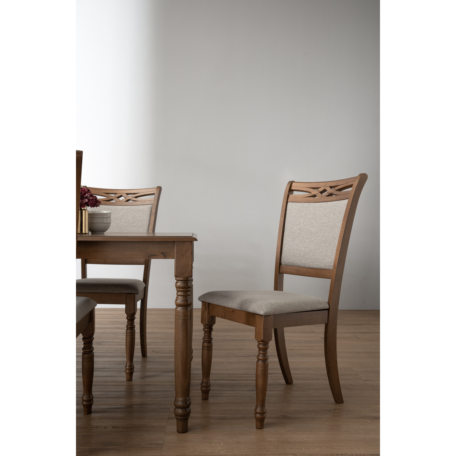 Unose dining chair in Cocoa colourframe, Dolphin colour Dimity fabric. The Unose Dining Chair combines Mid-Century Modern structure with Art Deco refinement. Crafted with Malaysian Oak legs in a cocoa finish, it brings durability and natural warmth. Upholstered in dimity fabric with a smooth dolphin tone, it delivers comfort and style. Its tall backrest and sculptural frame make it a standout choice for dining rooms, restaurants, or upscale commercial interiors.
