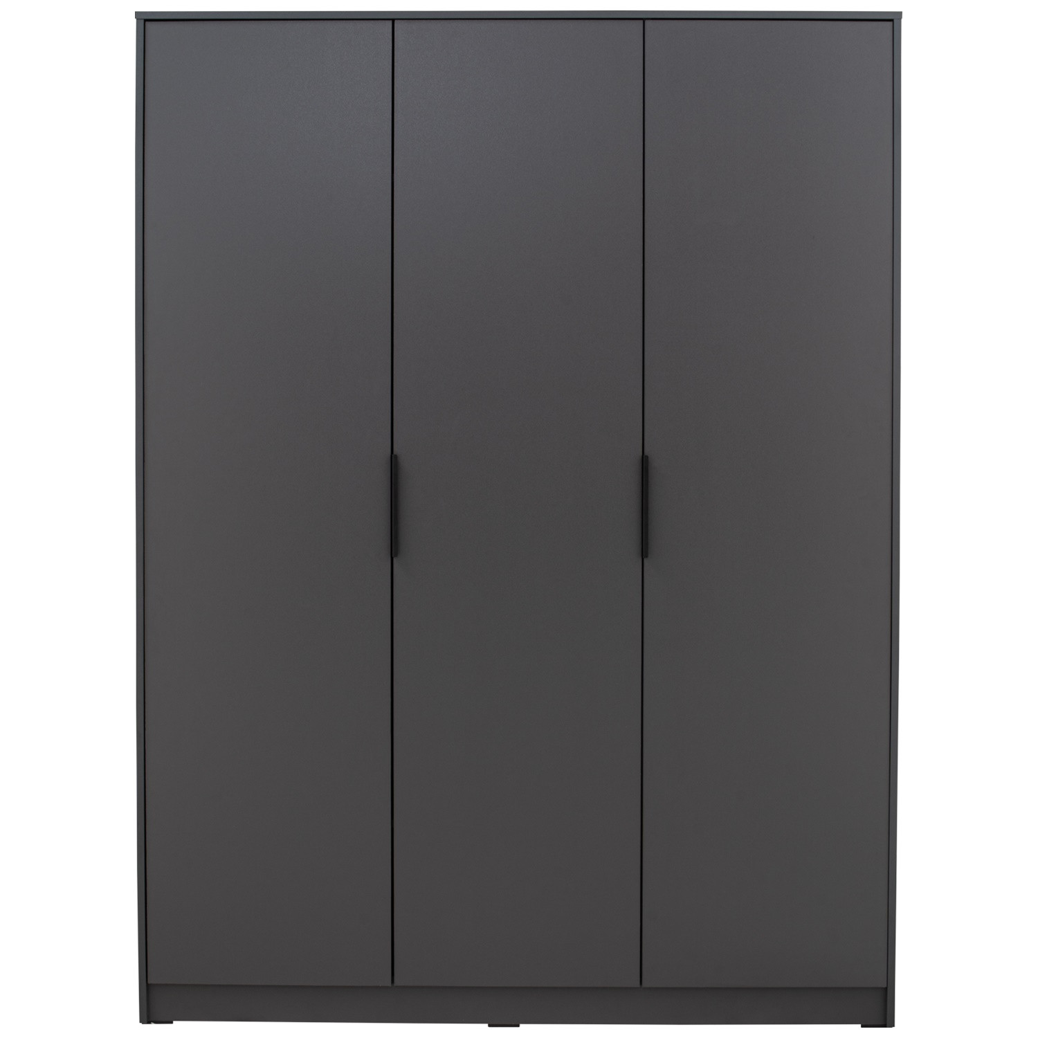 Volos 3 door wardrobe in Black colour. The Volos 3 Door Wardrobe features a modern minimalist design, fully constructed from laminated board in a sleek black finish. Its clean lines and bold, uniform tone give it a contemporary edge, making it perfect for urban living spaces. Behind its three doors, ample storage is provided for clothes, shoes, and essentials, ensuring both practicality and style. The simplicity of its design makes it versatile, easily blending with modern interiors while adding a sophisticated touch. Durable, functional, and easy to maintain, the Volos wardrobe is an excellent choice for everyday living.